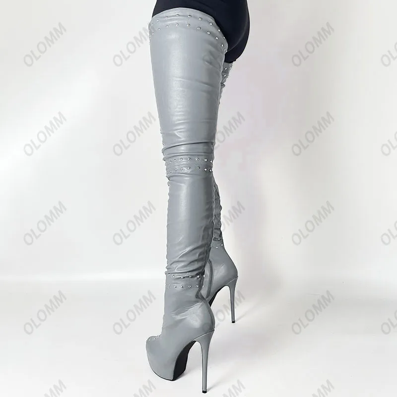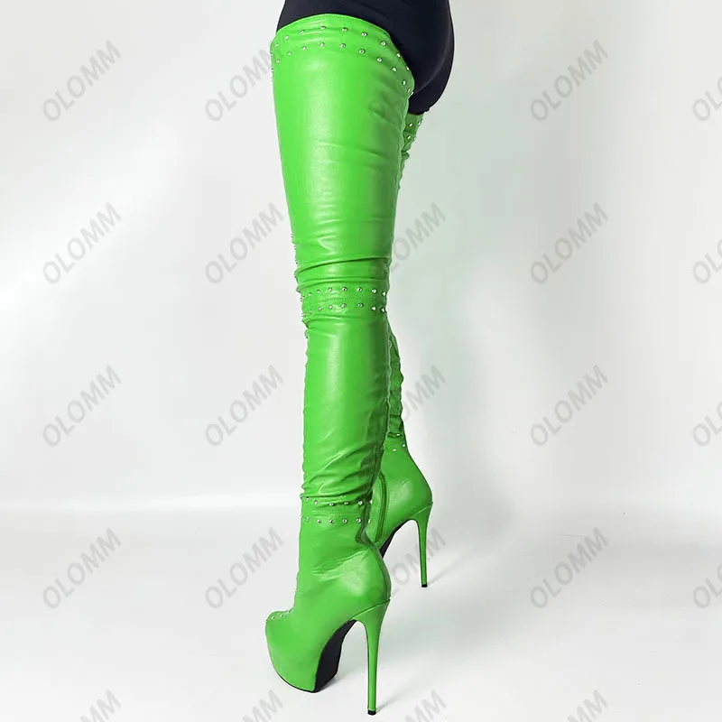 Olomm/Новинка; Пикантные женские сапоги до бедра на платформе с заклепками; Сапоги на высоком каблуке-шпильке; Клубная обувь красного цвета с круглым носком; Женская обувь; Большие размеры США 5-15Пожалуйста, используйте нашу таблицу размеров при выборе размера.