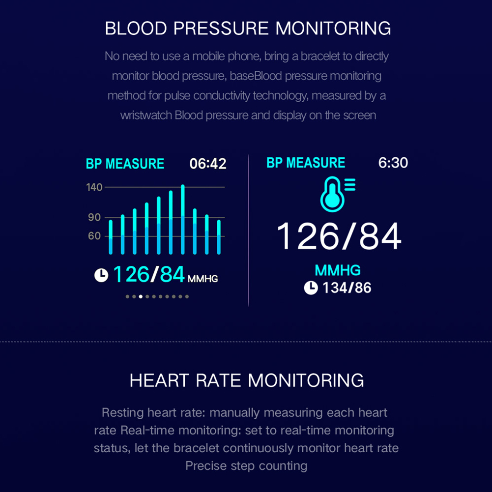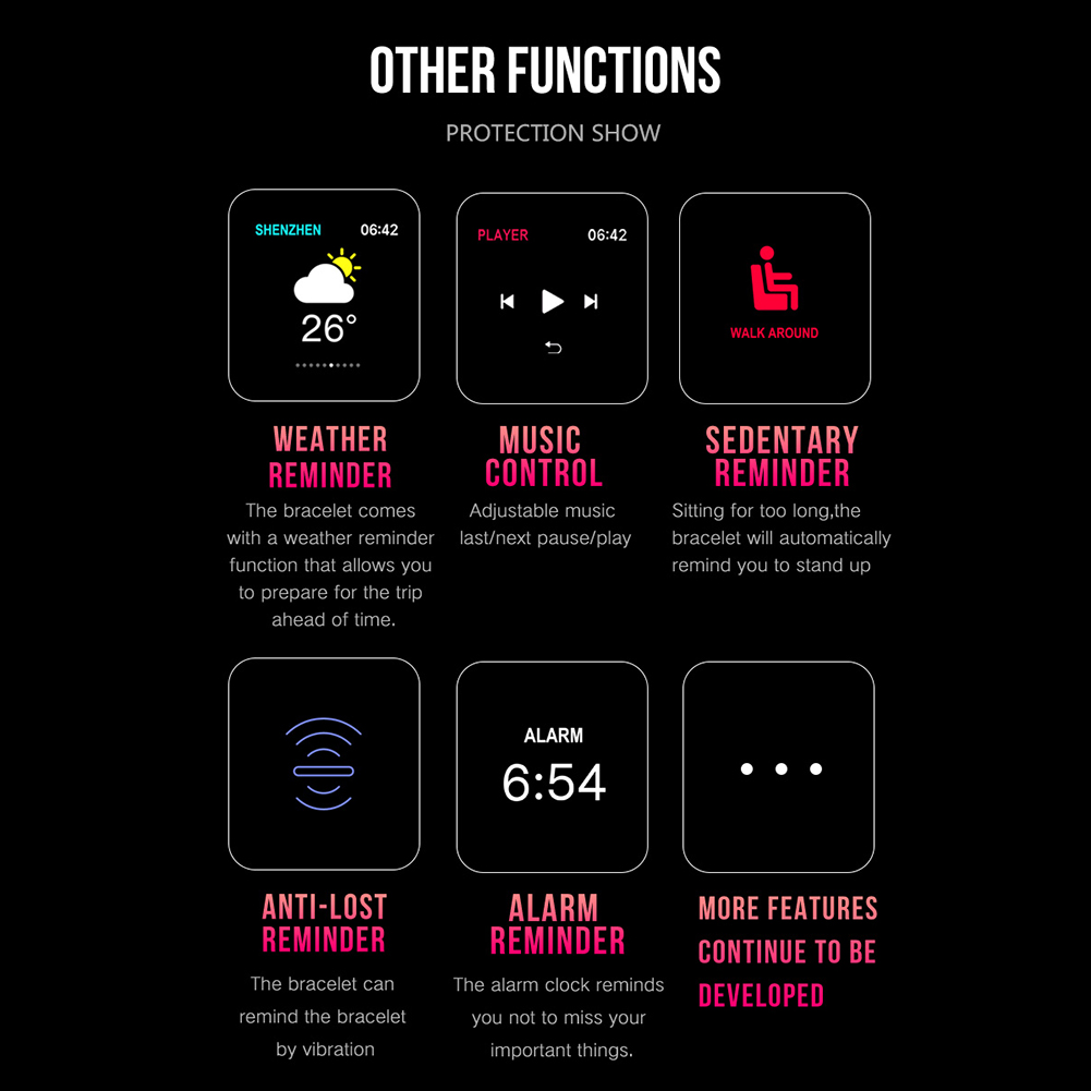 Режим не беспокоить, поднимите руку на яркий экран, настройка Формата времени, восстановление фабрики, длительное нажатие для отклонения входящих вызовов, три выбора интерфейса часов, управление музыкой (поддержка предыдущего, следующего, воспроизведение/пауза), отображение погоды, здоровье apple.
