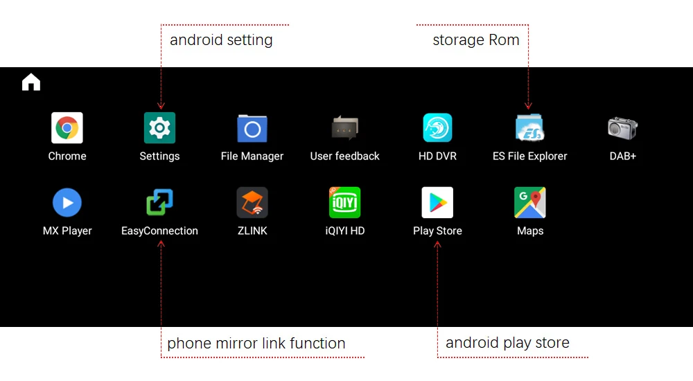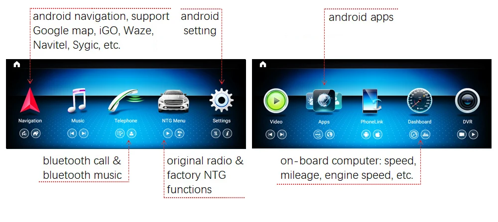 Функции Android включают навигацию Android, сенсорный экран, android музыку и видео, android bluetooth звонки и bluetooth музыка, USB, SD, android приложения установки, Wi-Fi функции и т. Д. Поддержка CarPlay и aftermarket камеры заднего вида и DVR