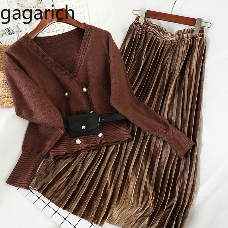 Gagarich Женский комплект из двух предметов модный новый костюм с поясом вязаный Топ свитер Золотая Бархатная плиссированная юбка комплект из двух предметов женский 2020