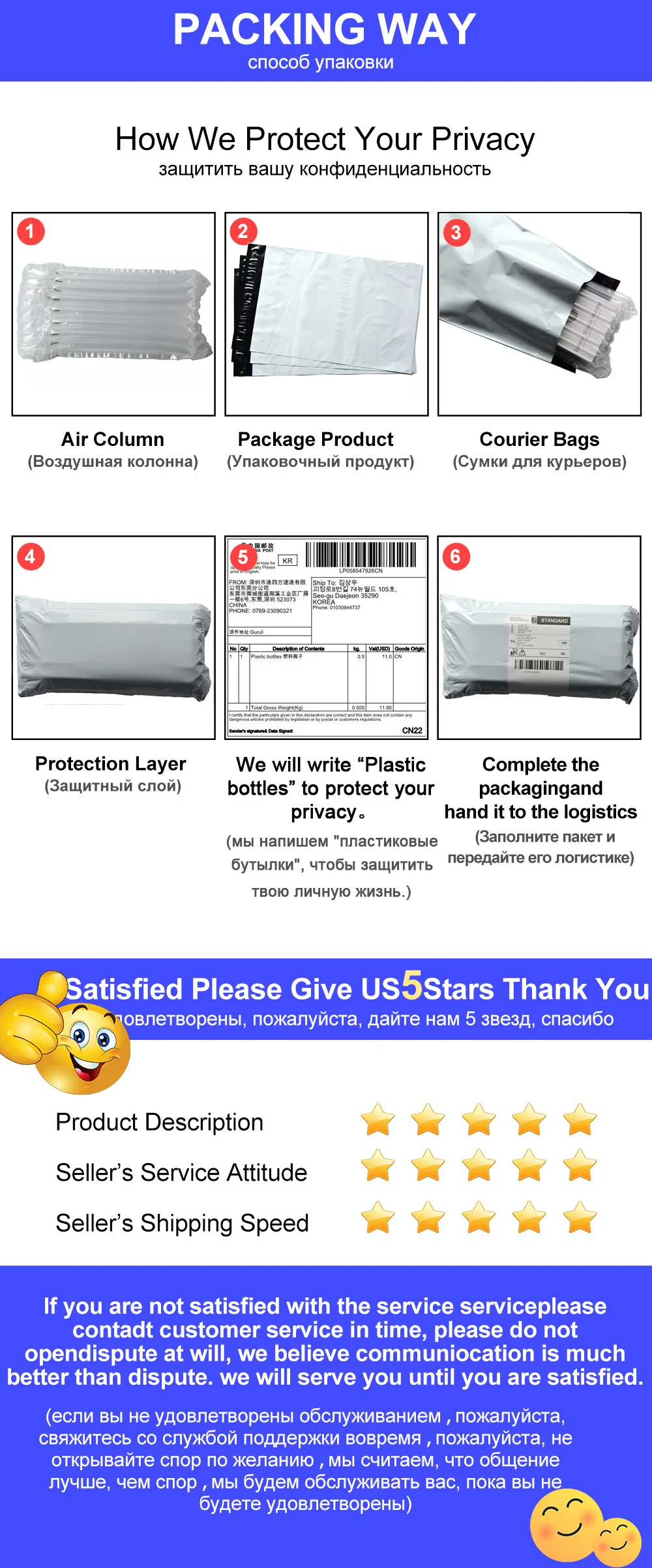 Ваша конфиденциальность очень важна для нас. По умолчанию в посылка входит «игрушки» (любые другие требования, пожалуйста, отправьте нам сообщение), и с нашей незаметной упаковкой вы можете делать покупки с уверенностью, единственный человек, который знает, что внутри посылка, это вы! Чтобы защитить вашу конфиденциальность, мы отправим товар без нашей цветной посылка. Надеюсь, вы понимаете. Спасибо.