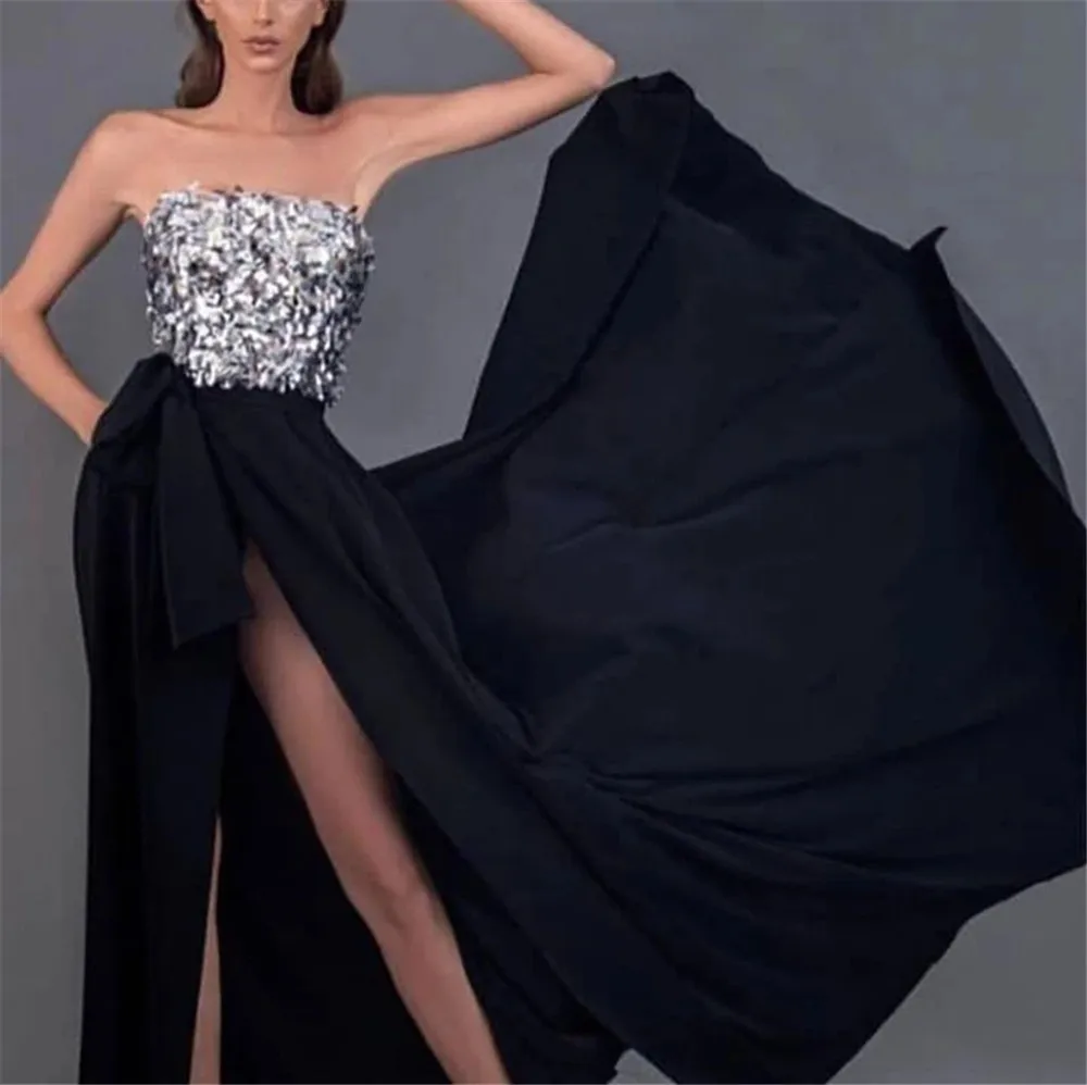 Сексуальные серебряные блестки с высоким разрезом платья для выпускного вечера 2020 черные вечерние платья с длинным рукавом с курткой Robe de soiree