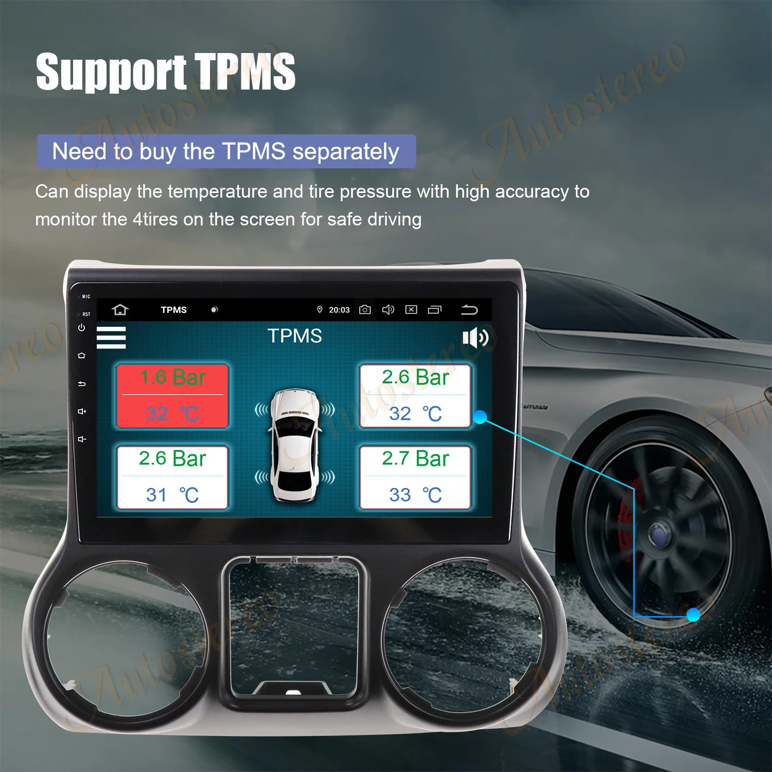 Может отображать температуру и давление в шинах с высокой точностью, чтобы контролировать 4 шины на экране для безопасного вождения. (Необходимо купить TPMS отдельно)