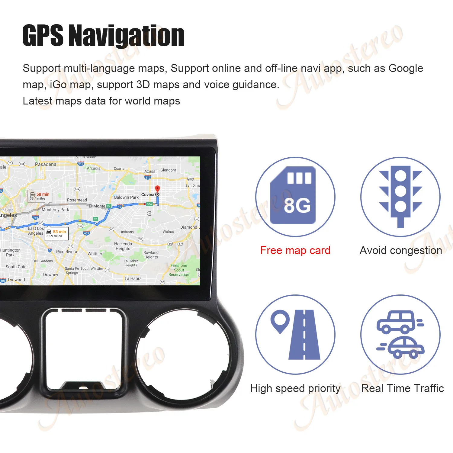 Поддержка многоязычных карт, поддержка онлайн и автономных навигационных приложений, таких как карта Google, карта iGo, поддержка 3D карт и голосовое руководство. Последние карты данных для карты мира.