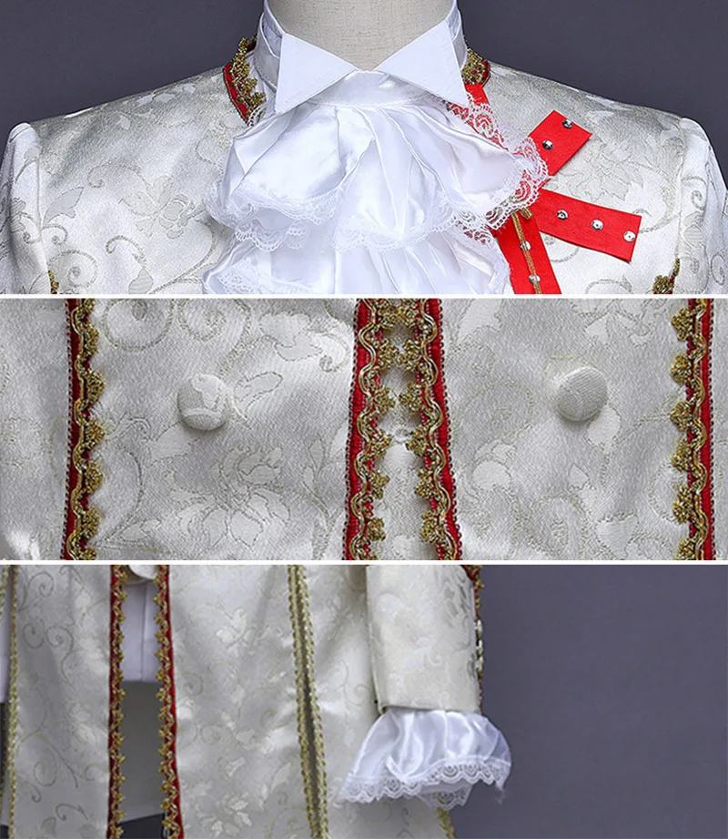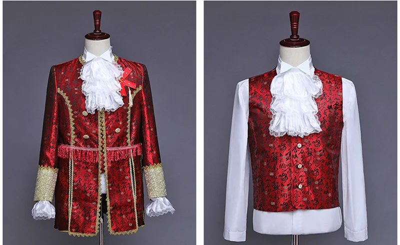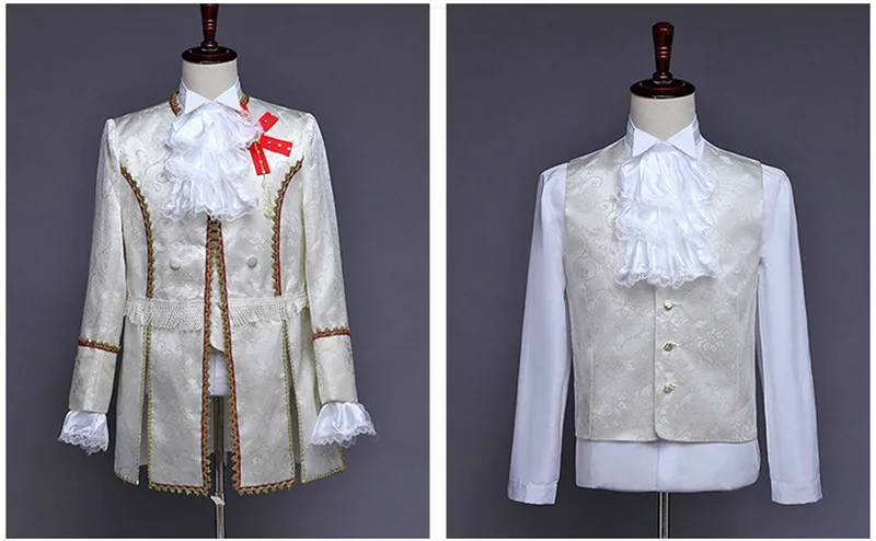 -Victorian costume. -Polyester fabric. -Fit for stage,ceremony,party,ball,prom,etc. -Package include:Jacket + Pants + Vest + Jabot tie + Cuffs.