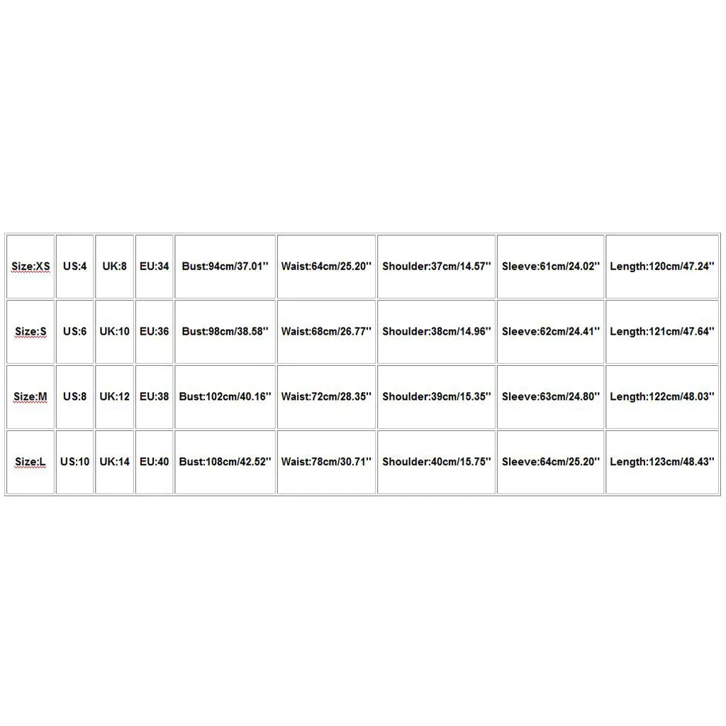 | Размеры: XS | Свяжитесь с нами: 4 | UK:8 | ЕС: 34 | Обхват груди: 94 см/37,01 дюйма | Эластичная резинка на талии: 64 см/25,20'' | Ширина плеч: 37 см/14,57 дюйма | Рукав: 61 см/24,02 дюйма | Длина: 120 см/47,24'' |