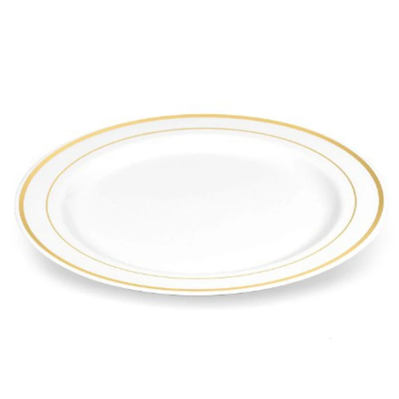 Стильный и элегантный-эти пластиковые столовые приборы и одноразовые пластины с золотыми ободками являются классическим дизайном, но не то же самое чудесное сочетание. Пластиковые Золотые Столовые приборы выглядят как настоящие золотые металлические столовые приборы. Гладкая тарелка, как Китай и фарфор, дает вам роскошное удовольствие, кроме того, различное сочетание дает вам различную идею.