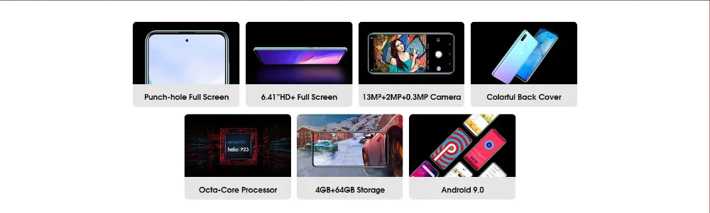 Экран -------- 6,41 ''Дырокол экран RAM + ROM-4 Гб + 64 ГБ Задняя камера ---- 13MP + 2MP + 0.3MP Тройная камера заднего вида Передняя камера--- Подача заявки на 8MP Передняя камера Аккумулятор -------- 3900 мАч (Typ) ОС ---------------- Android 9,0, поддержка нескольких языков, поддержка сервиса Google, поддержка OTG, защита от отпечатков пальцев Сеть ------ двойной Nano слот для sim-карты 2G: GSM-B2/B3/B5/B8 3G: WCDMA-B1/B8 4G: TDD-LTE-B40/B41 FDD-LTE-B1/B3/B7/B8/B20