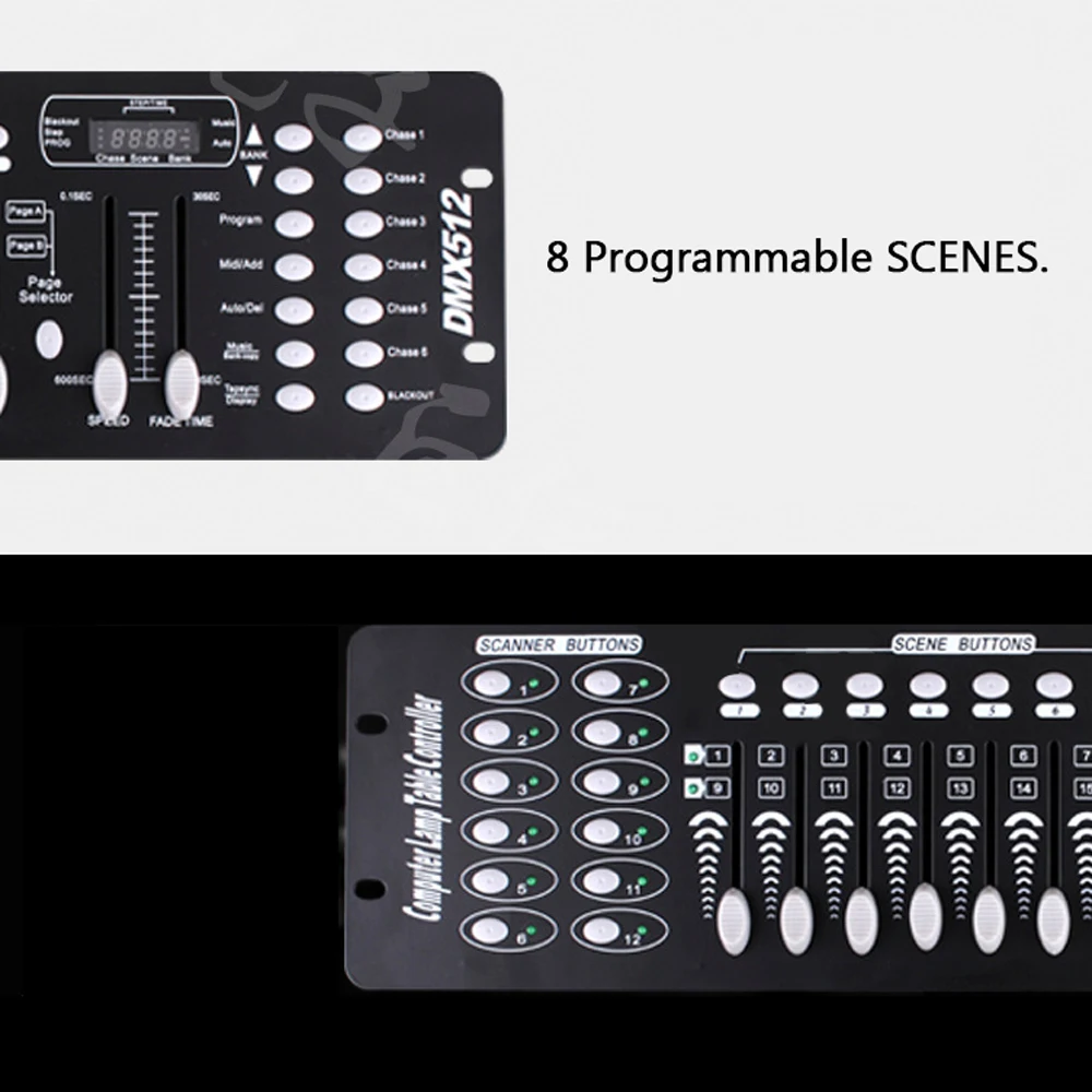 192 DMX контроллера, международный стандарт DMX 512 singal, ЖК-экран, 16*2 символов, 48 каналов затемнения, 6 программируемых погрешностей 240 сцен. С помощью этого оборудования вы можете создать более совершенный этап спецэффектов.