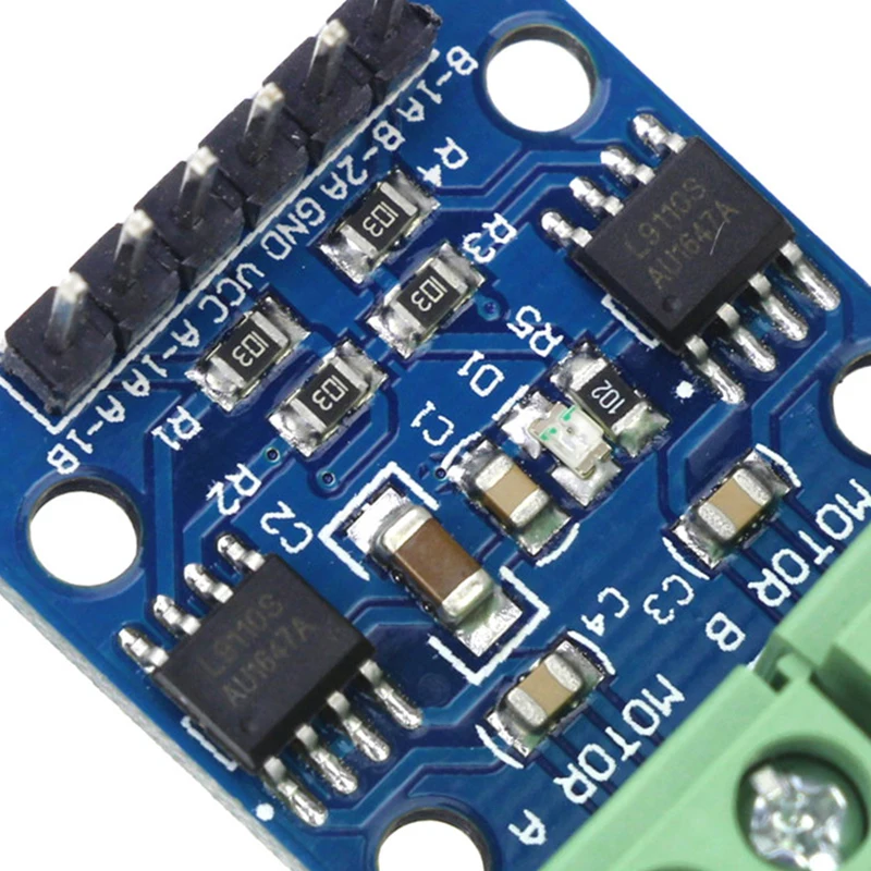 1 L9110S-chip привод двигателя 2 модуль Напряжение питания: 2,5-12V 3 подходит двигатель диапазон: между рабочее напряжение двигателя 2,5 v-12V, максимальный рабочий ток 0.8A, в настоящее время салона автомобиля напряжение и ток рынок находятся в этот диапазон 4 привод два двигателя постоянного тока или 4-х проводной 2-фазный шаговый двигатель. 5 Размер печатной платы: 2,8 см * 2,1 см ультра-маленький размер, подходит для сборки 6 снабжен фиксированными монтажными отверстиями, диаметр: 3 мм Интерфейсы модулей: