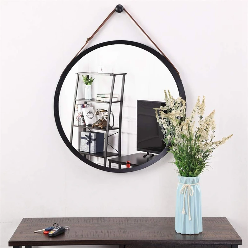 Подвесное круглое настенное зеркало в ванной и спальне-прочная бамбуковая рамка и регулируемый кожаный ремешок