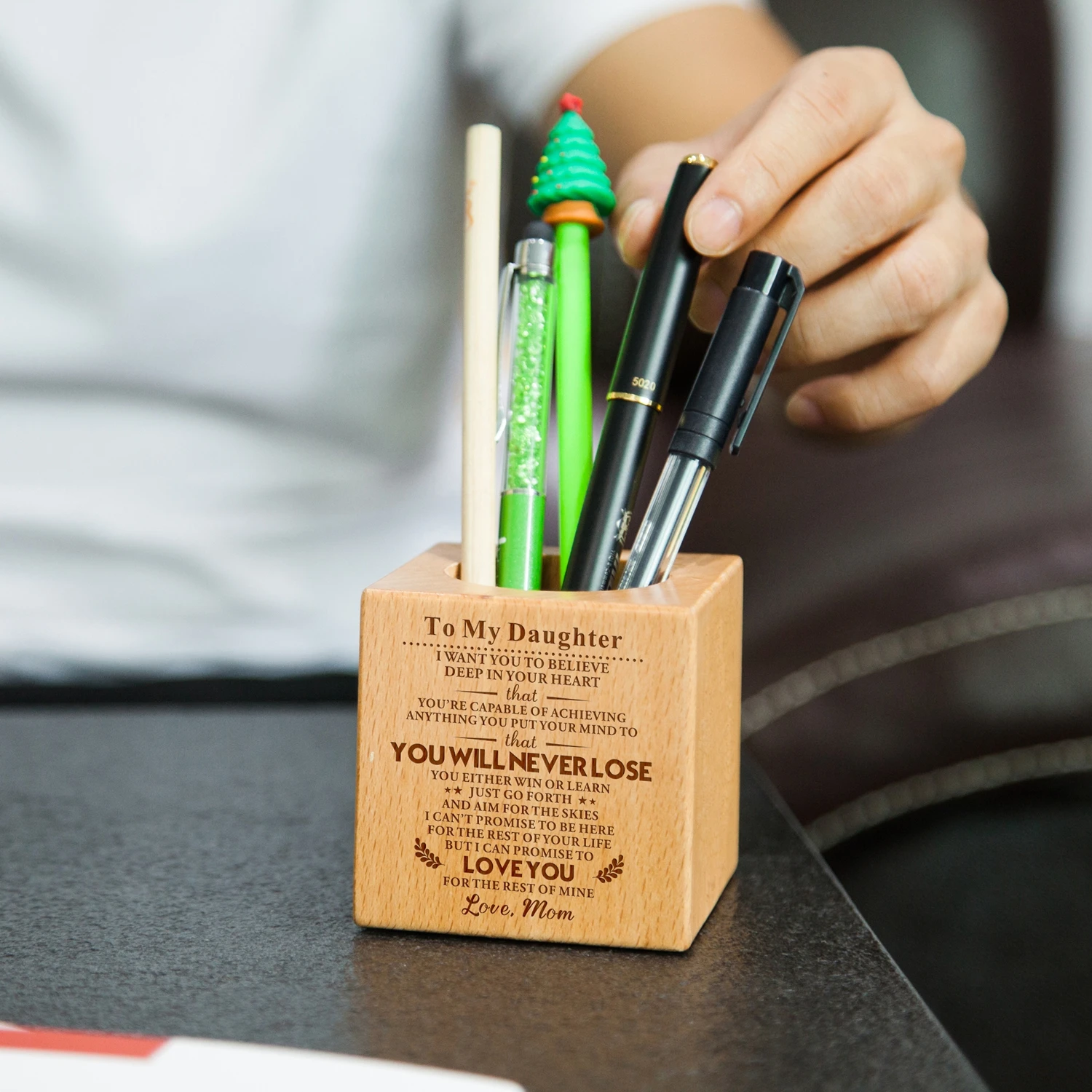 Вы ищете уникальный подарок для вашей дочери? Ваши поиски закончены! Эта ручка с гравировкой держателя идеальна! Подарок, который он будет ценить на всю жизнь! Это держатель ручки с гравировкой значимого сообщения на поверхности держателя, который помогает ему длиться навсегда.