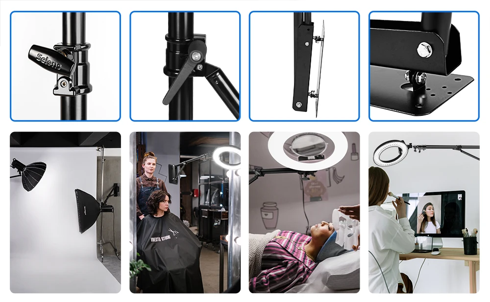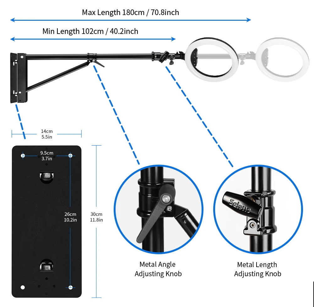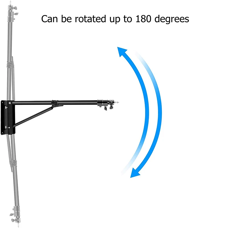 Стрела с кольцом для крепления на стене предназначена для увеличения от 39,4 до 70,9 дюймов и может поворачиваться до 180 градусов, что позволяет регулировать угол крепления на стену студии в соответствии с вашими потребностями.