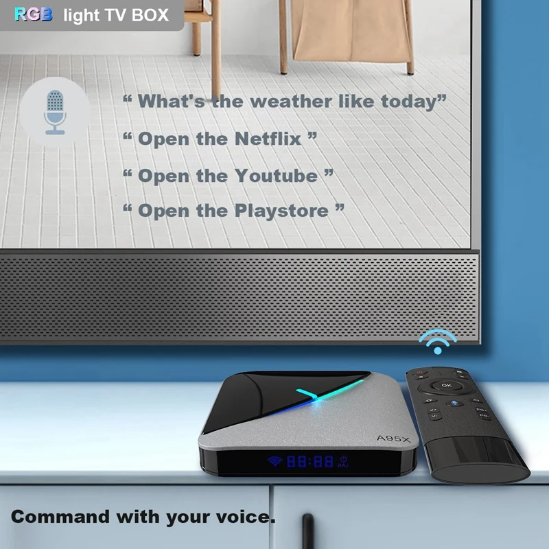 В A95X F3 Ария: 4 Гб + 64 ГБ + 2,4 и 5G двухъядерный процессор Wi-Fi + BT4.2 + 100 м