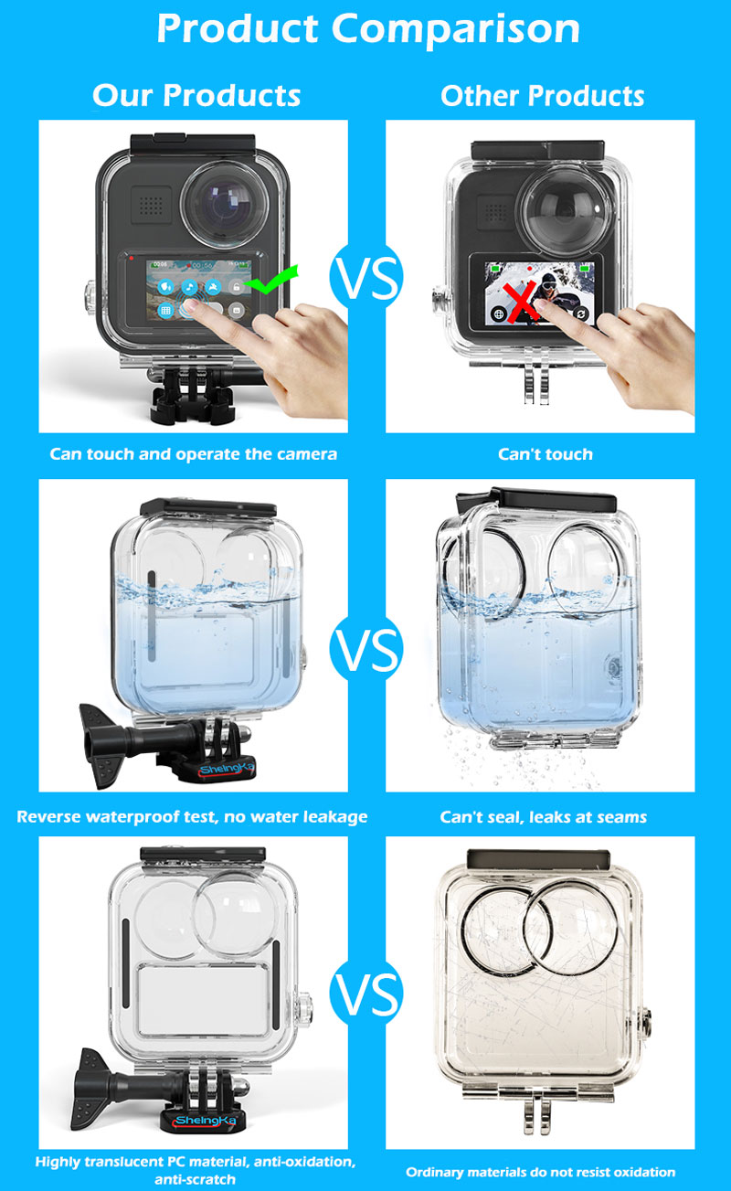 Водонепроницаемый чехол с рамкой для Gopro MAX, чехол-накладка для сенсорного экрана, защитный футляр для дайвинга, аксессуары для камеры Gopro MAX Особенности: -Задняя крышка сенсорного экрана высокой четкости, которую можно напрямую использовать, не снимая камеру, простая и удобная -Водонепроницаемость 20 метров, сенсорная глубина -Кнопка из нержавеющей стали, предохранительный замок, защита от окисления, защита от коррозии морской воды -Прозрачный материал, поликарбонат, не влияет на светильник камеры при съемке -Композитный материал высокой плотности, защита от падения, сжатия, царапин, Защита камеры -Обеспечивает УФ-фильтр для объектива для защиты объектива Параметры: Цвет: Прозрачный Вес: около 87 г Материал изделия: поликарбонат, нержавеющая сталь 316 Материал линз: HD Поликарбонат, светильник с коэффициентом пропускания выше 95%, высокая твердость выше 9H Поддержка глубины воды: 20 метров Класс IP: IP68 Функции: водонепроницаемый, пыленепроницаемый, ударопрочный, устойчивый к давлению Подходящие модели: GOPRO MAX Посылка включает в себя: Водонепроницаемый чехол Gopro MAX, 1 шт. Защитный колпачок для объектива-1 шт. Противотуманная вставка-6 шт.
