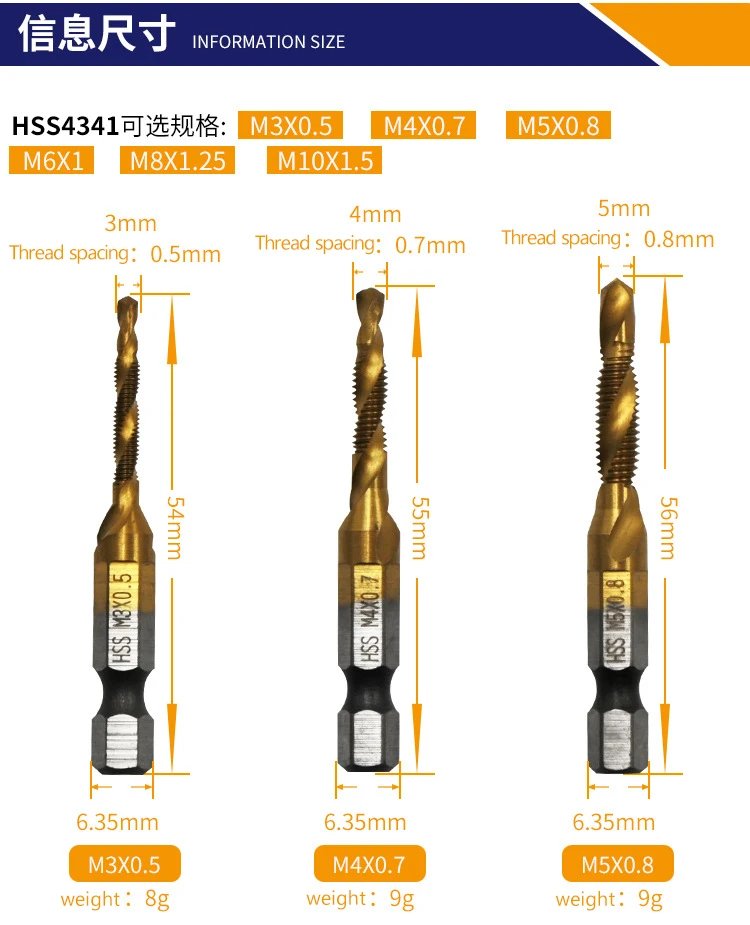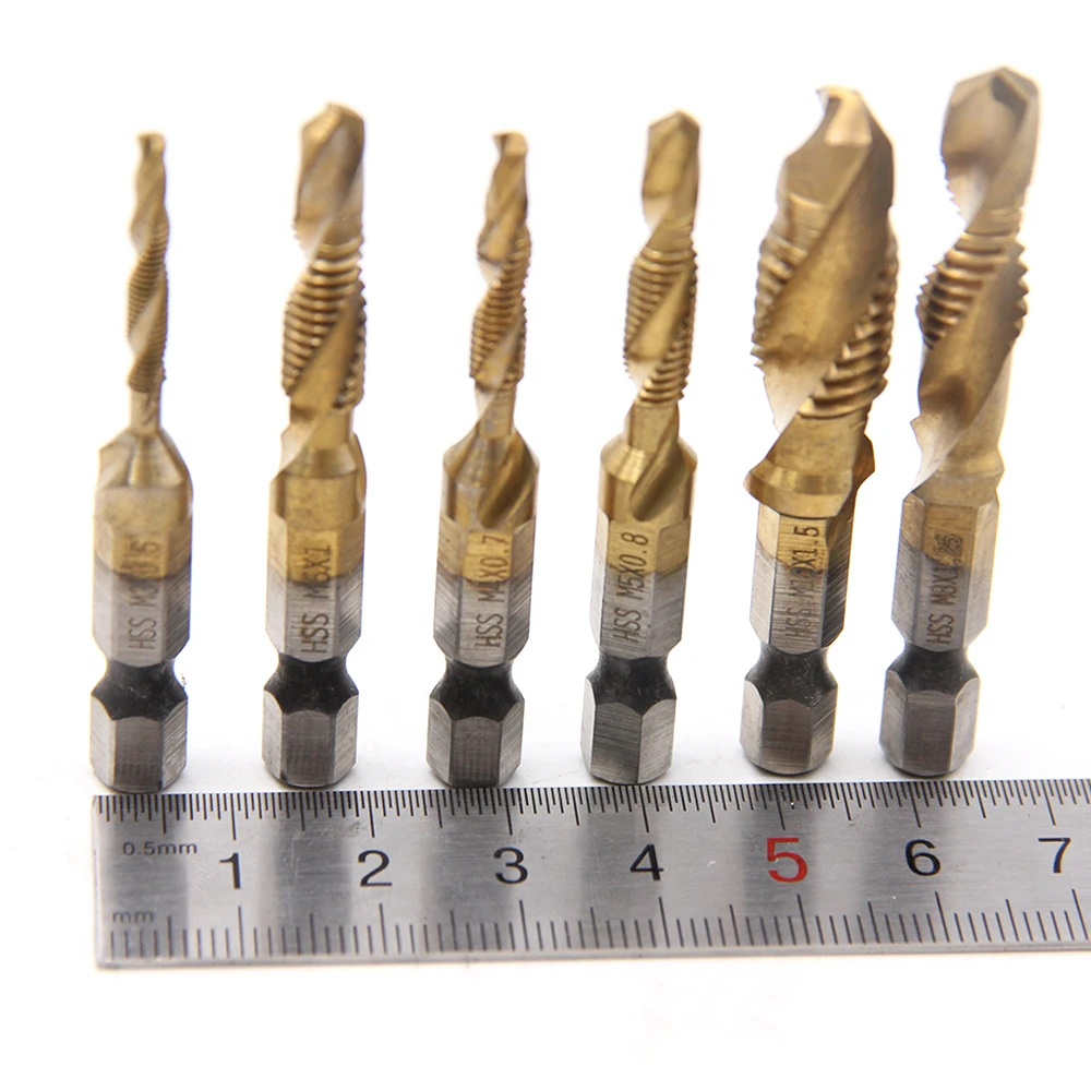 Описание:6 шт. HSS 4341 титановое покрытие M3-M10 комбинация сверла набор сверл 1/4 дюйма шестигранные метрические сверла