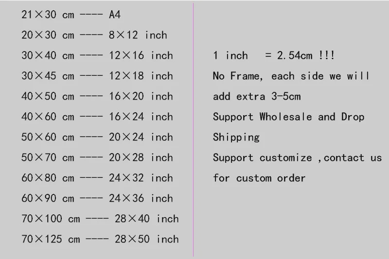 4. Этот холст отличного качества без внутренней и внешней рамки, чтобы сохранить стоимость доставки, но этот размер является обычным размером фоторамки, и вы можете легко получить готовую рамку.