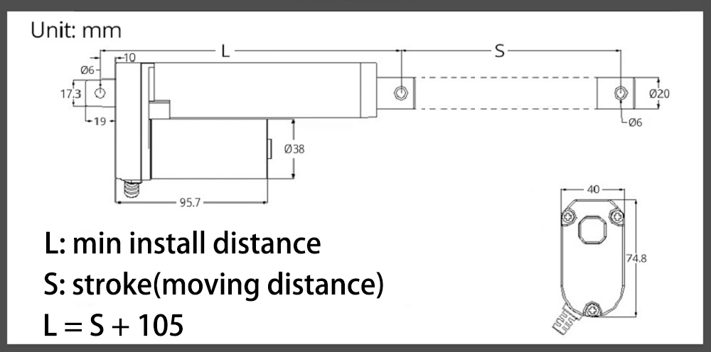 (2): After the linear actuator is fully extended, the center distance between the two mounting holes is the maximum installation distance of the linear actuator = 105mm + S (stroke length) + S (stroke length)