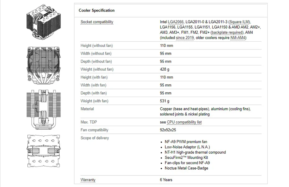 NH-D9L-это двухбашенный кулер для процессора премиум-класса, который был разработан таким образом, чтобы обеспечить отличную бесшумную производительность охлаждения на высоте всего 110 мм. Его сравнимо низкий профиль (15 мм ниже, чем классические 9 см башенные Кулеры, такие как NH-U9S) не только гарантирует полное соответствие требованиям 3U, но и делает NH-D9L идеальным для компактных корпусов HTPC и небольших форм-факторов, которые имеют пути воздушного потока параллельно материнской плате. Благодаря отпечатку экрана 95x95 мм NH-D9L очищает ОЗУ и Слоты PCIe на всех материнских платах на базе Intel и большинства материнских плат на базе AMD ITX. Входящий в Комплект Вентилятор NF-A9 premium поддерживает автоматическое управление скоростью через PWM для исключительной бесшумности работы, а второй, дополнительный NF-A9 вентилятор может быть добавлен для повышения производительности в режиме двойного вентилятора. Топ с надежным, pro-grade SecuFirm2™Мульти-розетка Монтажная система, Noctua проверенный NT-H1 термопастой и полный 6 лет гарантии производителя, NH-D9L образует очень компактный премиум пакет для применения с ограничением пространства.