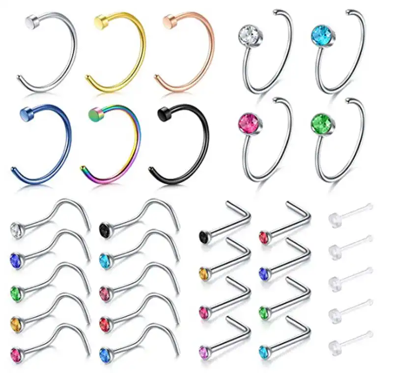 Вы получите: 18 г (1,0 мм) Разноцветные кольца носа, 6 шт C кольца носа, кране 8 мм; 8pcs L формы носа, заклепки, длина ПИН-кода 7 мм, Cz диаметр 2 мм; 4 шт кольцо в нос с Cz камнем, внутренний диаметр 8 мм, Cz диаметр 2 мм; 10 шт. носовые винты, Длина штифта 7 мм, Cz диаметр 2 мм