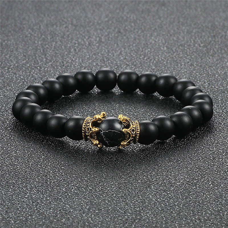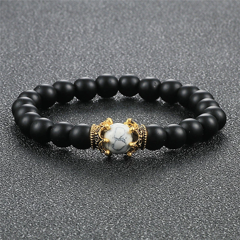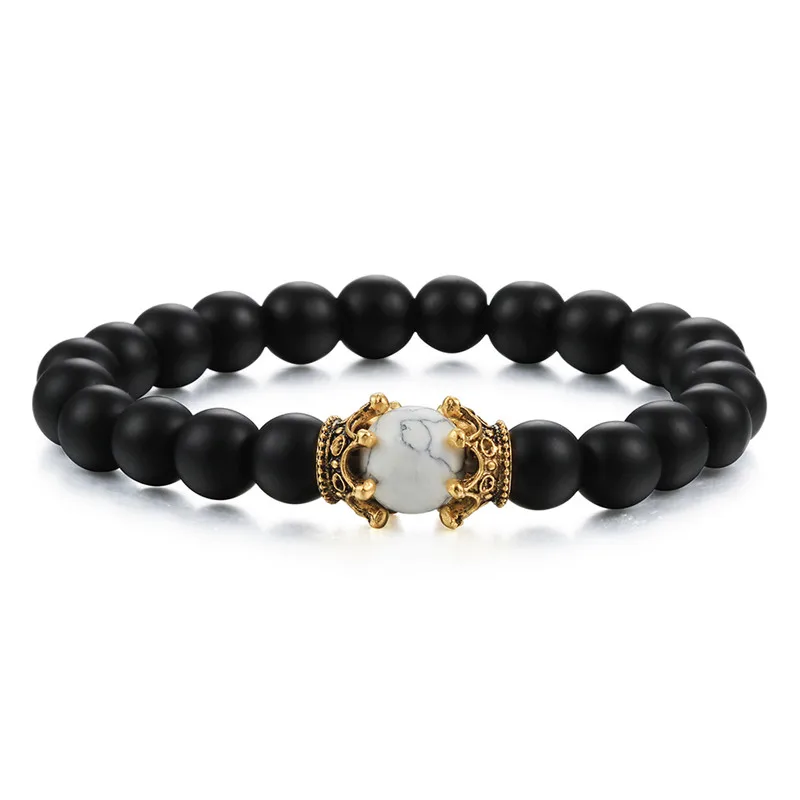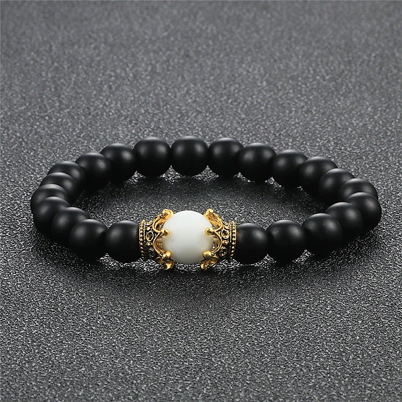 8mm Natural Matte Stone Black White Bead Charm Bracelets&Bangle King Queen Crown Handmade Elastic Bracelet for Woemn Men Jewelry