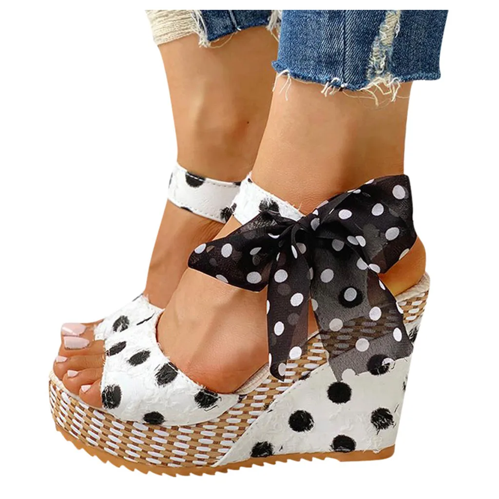 Женская ПлатформаКлиньяБосоножки на каблуке; Модная обувь на шнуровке в горошек
