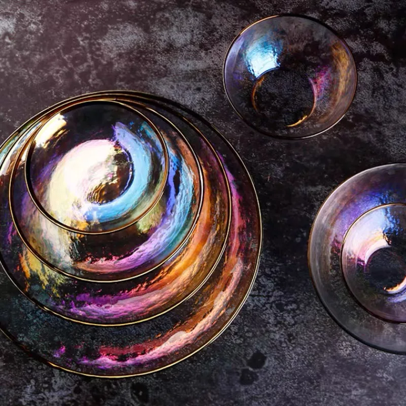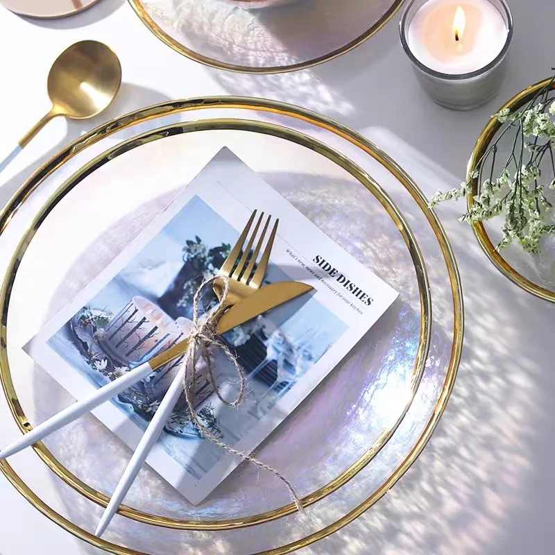 Красочная Радужная посуда тарелка для ужина Золотая оправа стеклянная тарелка для торта Салатница для еды посуда тарелка