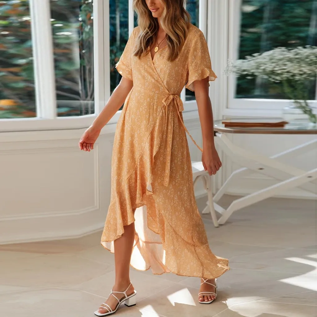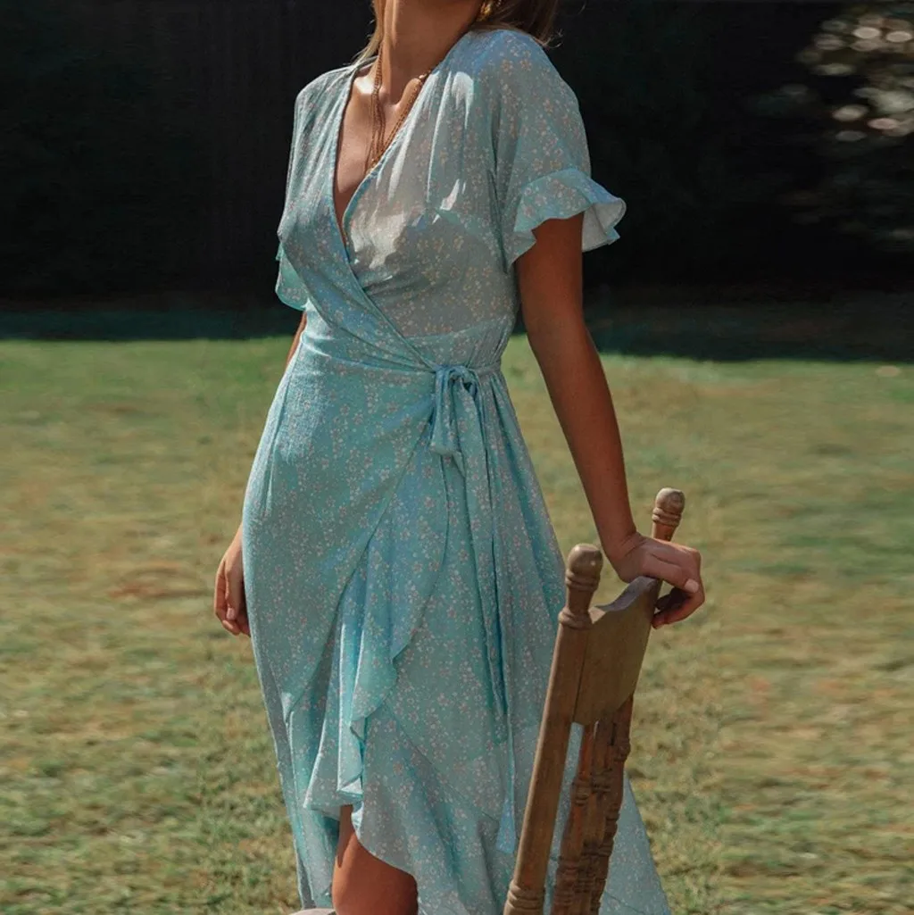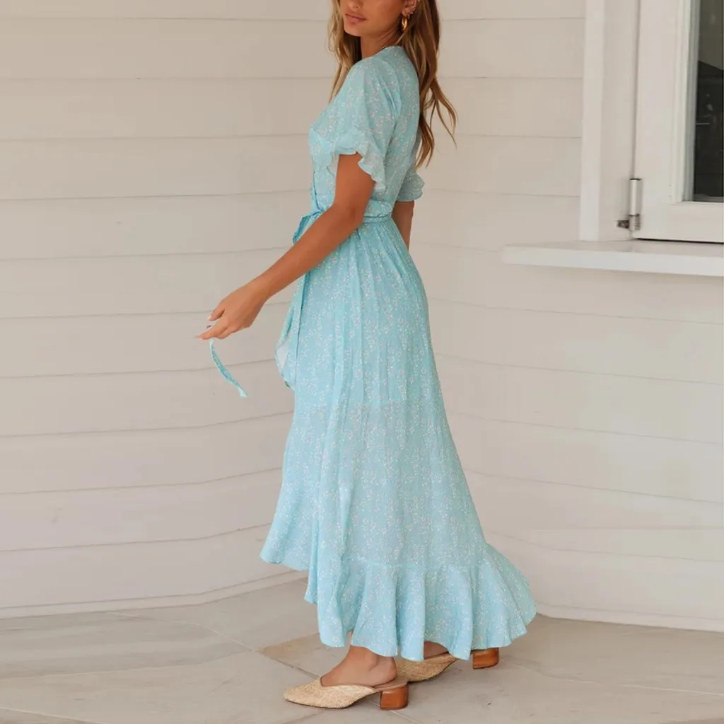 Женское платье в стиле бохо, сексуальное длинное пляжное платье без рукавов с цветочным принтом и v-образным вырезом, повседневное Асимметричное Платье макси с оборками, Vestido