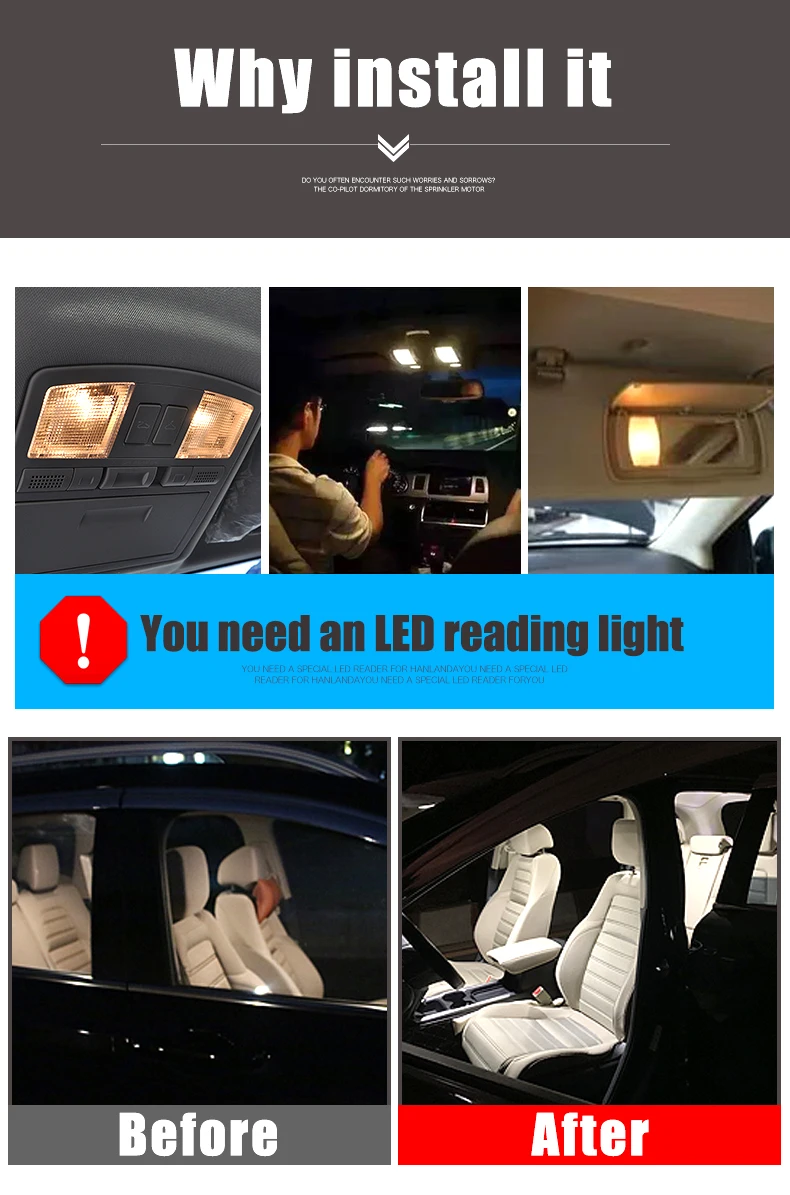Светильник для чтения переднего ряда (3 шт.) Светильник для чтения заднего ряда (3 шт.) Светильник для перчаток (1 шт.) Светильник багажника (1 шт.) Тип интерфейса: T10(W5W/194)/Festoon-31mm/Festoon-36mm/Festoon-39mm/Festoon-41mm Световой поток: керамический T10 (312лм/лампа); Напряжение: 12 В Мощность: керамический T10(3 Вт/9 Вт); Тип светодиодного чипа: 5630/4014 Цвет: белый (6000K) Материал корпуса: алюминий/керамика Характеристика: 1. Светодиодный светильник: безотказный дизайн CAN-bus (без предупреждающего сообщения на приборной панели, без мерцания/проблем с освещением), неполярность, подключи и работай. 3. Светодиодный светильник на танкетке чувствителен к полярности, поэтому в чехол лампа не включится, пожалуйста, переверните его на 180 градусов. (потому что светодиодный светильник имеет полярность, как батарея)