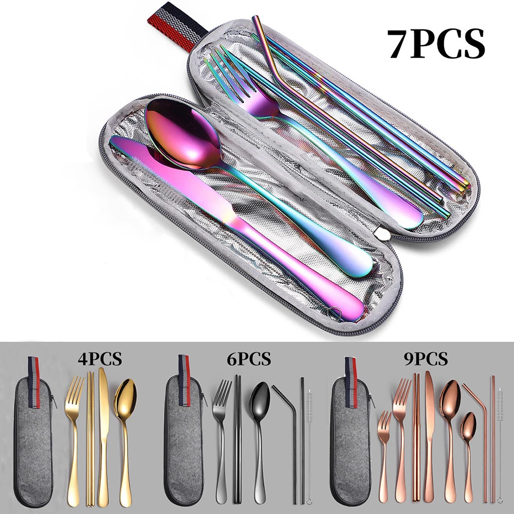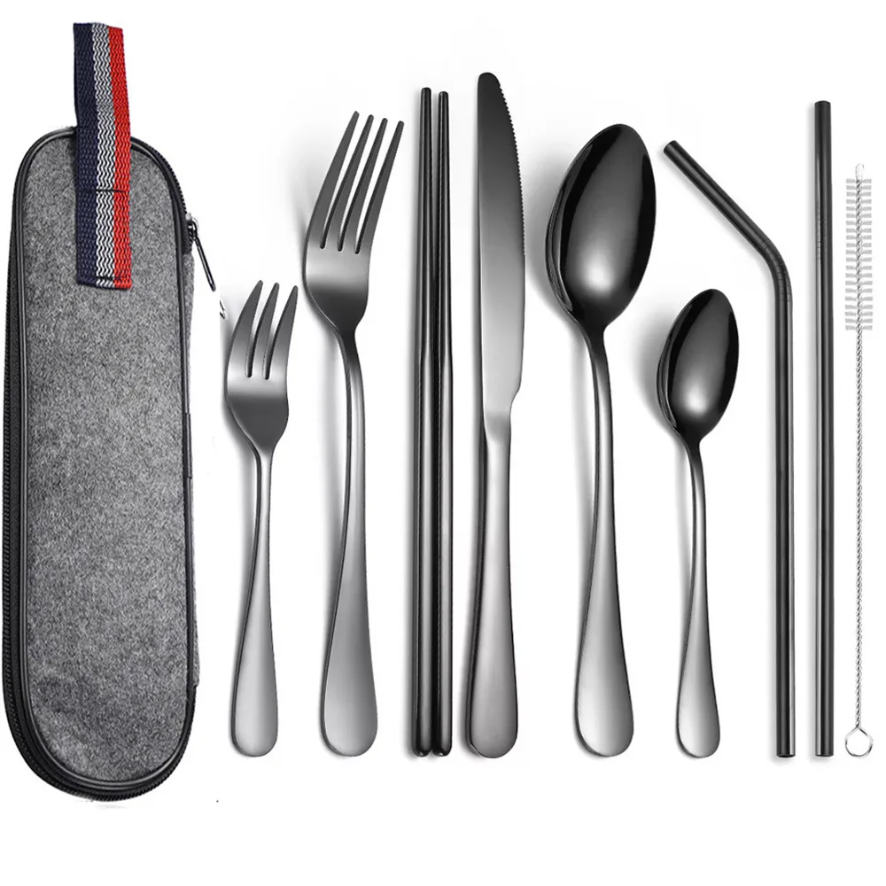 1 посылка включает в себя: 1 Обеденный нож, 1 столовая вилка, 1 столовая ложка, 1 фруктовая вилка, 1 чайная ложка, 1 пара палочек для еды, 2 соломинки, 1 щетка для чистки соломинок, 1 серый пакет.