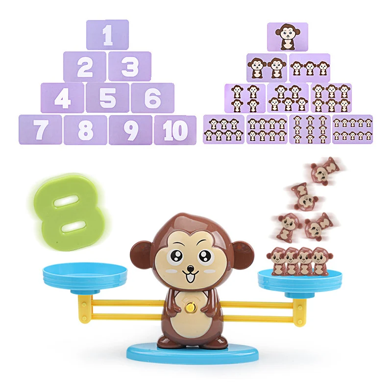 Этот набор из 65 предметов включает в себя: 19 обезьян, 1-10 фигурок, 30 двусторонних карточек, весы с обезьянами, основание, 2 циферблата и удобные для чтения инструкции.
