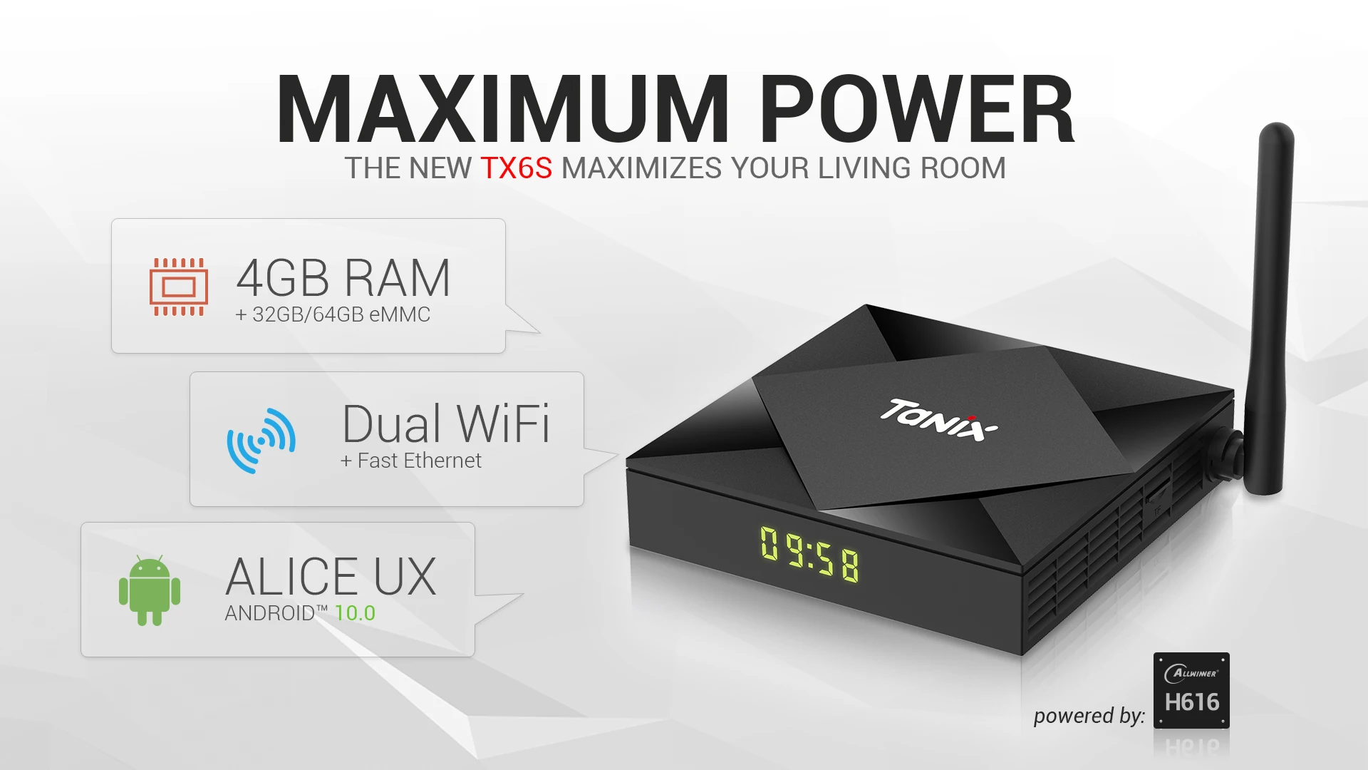 1. Четырехъядерный процессор Allwinner H616 ARM Cortex A53; 2.GPU: Mali G31™MP2; 3. ОС Android 10,0; 4. RAM/ROM: 2G/8G, 4G/32G, 4G/64G; 5. Поддержка H.265, 6K, 4K, HDR, HD2.0, 3xUSB2.0; 6. Поддержка 10/100 м Ethernet, 2,4 ГГц и 5 ГГц двойной Wifi; 7. Поддержка обновления прошивки онлайн (OTA).