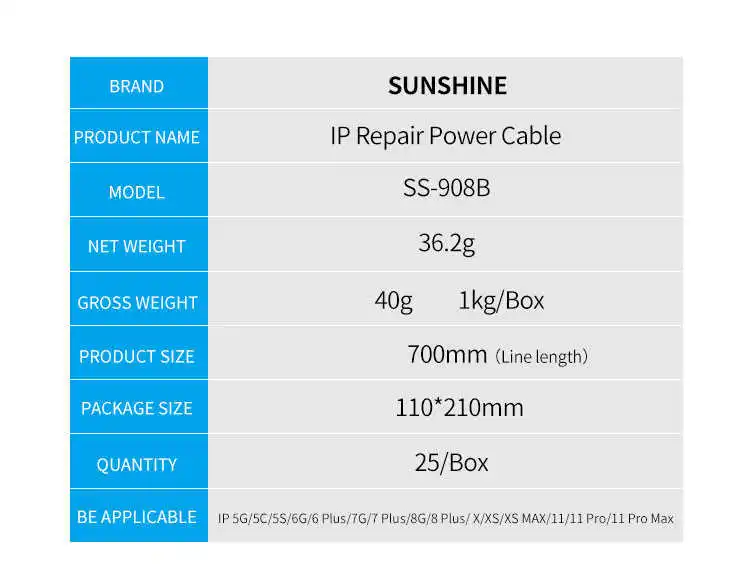 Sunshine SS-908B Тестовый Кабель питания для iPhone 5G-8G/XS/11 Pro Max для Apple, логическая плата, зарядный провод, материнская плата, ремонтная линия