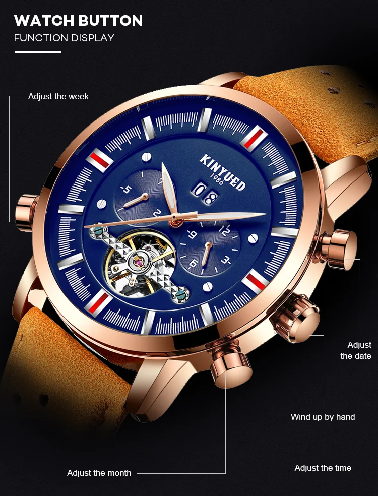 Специальные функции: мировое время, Ночной светильник, турбийон, отображение недели, отображение месяца, календарь, перспективное окно, инструкции на 24 часа.