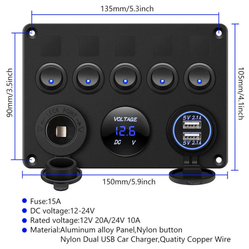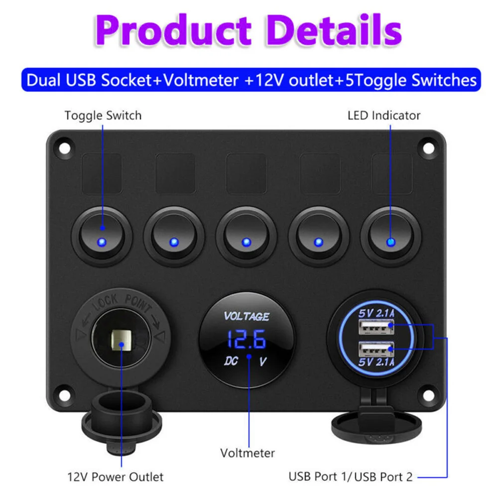 *Multi-function switch panel dual USB socket + voltmeter + 12V socket + 5 toggle switches