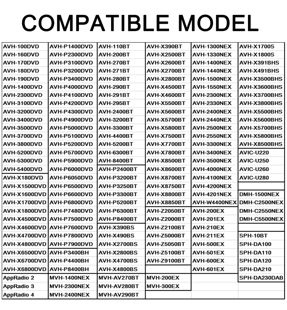 AVH-110BT, AVH-200BT, AVH-270BT, AVH-271BT, AVH-280BT, AVH-290BT, AVH-291BT, AVH-295BT, AVH-2400BT, AVH-3200BT, AVH-4400BT, AVH-3300BT, AVH-5200BT, AVH-6300BT, AVH-8400BT