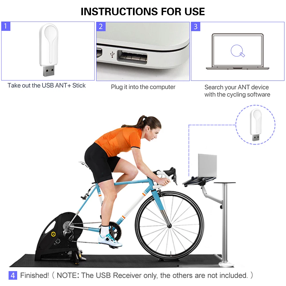 Легко Подключите приемник ANT + USB к компьютеру, и он будет получать данные автоматически, когда совместим с вашим велосипедным тренером в диапазоне 0-5 м. Вы можете тренироваться дома с легкостью, что является лучшим решением для обучения велосипеду в помещении.