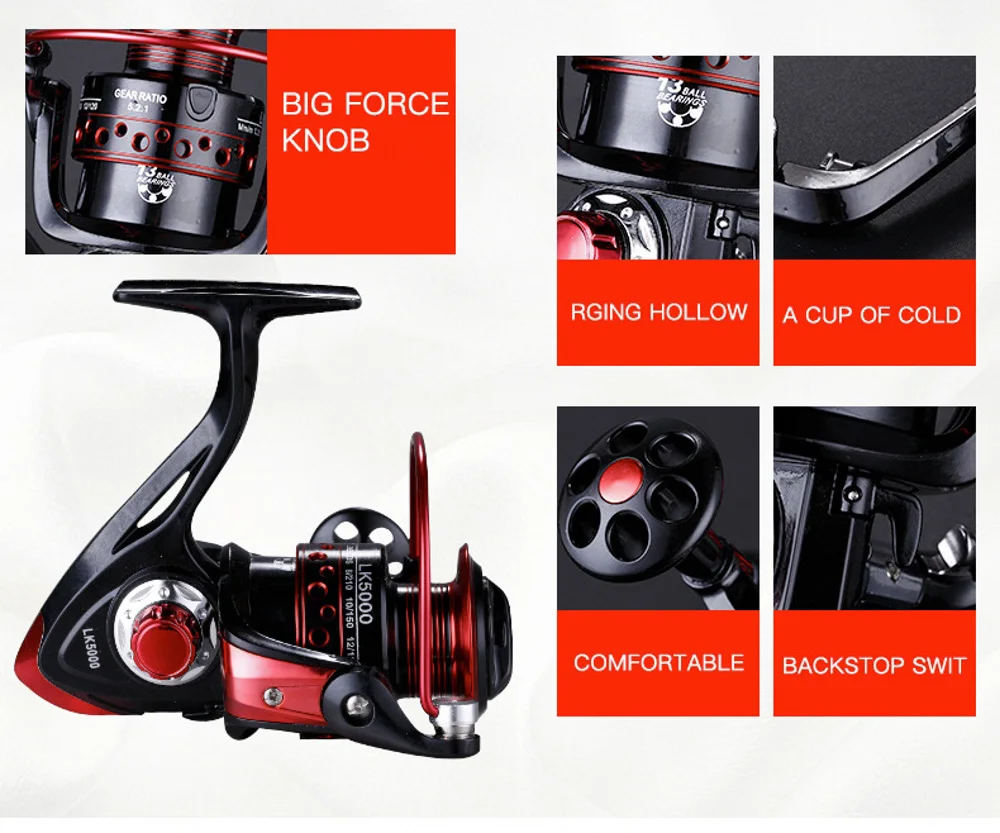 Модель: LK5000 Проволочная чашка: двухцветная цельнометаллическая проволочная чашка Встряхивание: ручка в форме сливы Подшипники: 13 + 1BB Скорость передаточное число: 5,2: 1