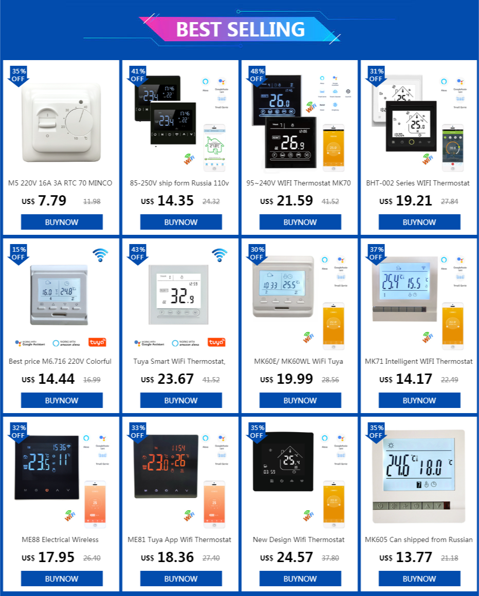 1. Функция памяти Запомните все ваши настройки после резкого отключения. Когда питание снова включено, вам не нужно сбрасывать его. 2. Возможности программирования устройство Поддержка 5 + 2 /6 + 1 / 7 дней в неделю программируемый таймер, шесть циклов программируемая настройка температуры температура воздуха. 3. Поддержка Wi-Fi, приложение дистанционного управления с помощью мобильного телефона. Одному мобильному телефону может управлять одним устройства, а также может управлять несколькими устройствами. С функцией голосового управления, совместима с Amazon Alexa и Google Home. 4. Руководство пользователя или автоматической функцией 5. Сенсорные клавиши, полноэкранный дисплей.Комплектация: термостат-1 шт.