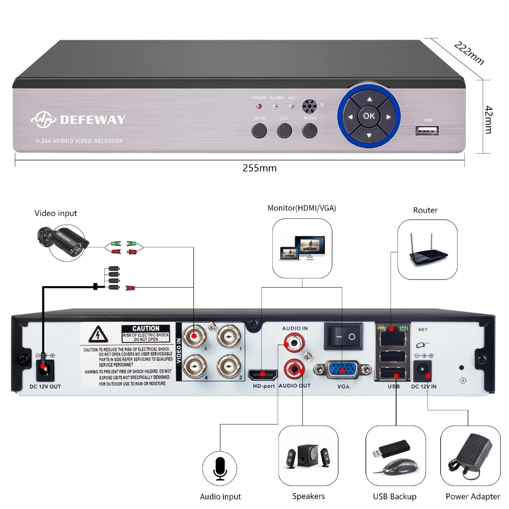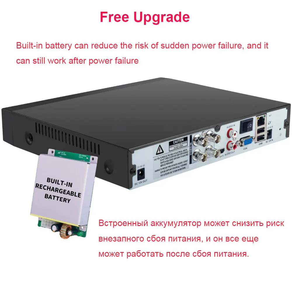 Входы/выходы Видео вход: 4CH BNC Видеовыход: 1ch HDMI/VGA Аудио вход: 1ch RCA Аудиовыход: 1ch RCA Usb-порт: 2 * USB 2,0 Сеть: RJ45 100 м Жесткий диск: Поддержка 3,5 "жесткого диска (до 4-х никель-металл-ТБ) Разъем входного питания DVR, Выходной разъем для камеры Главный выключатель питания Поставляется с аккумулятором, который все еще может использоваться в течение короткого периода отключения питания.