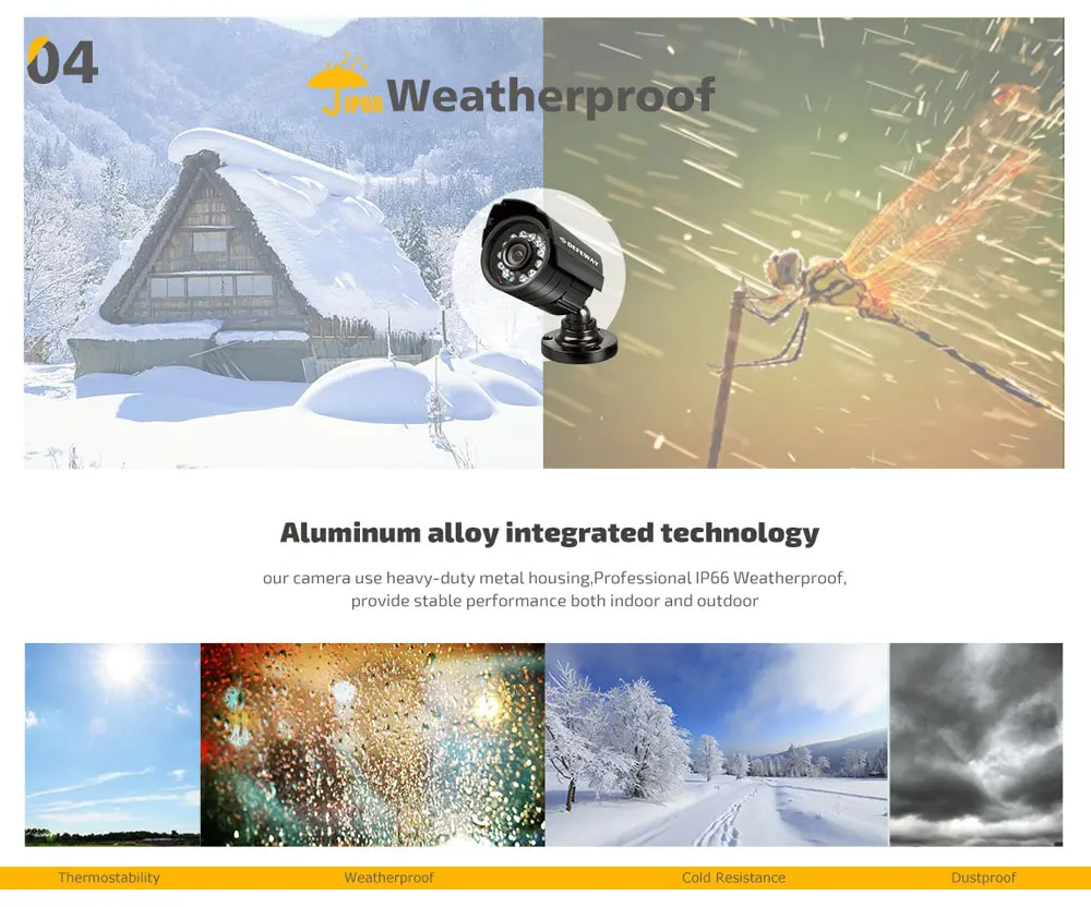 720P цветное изображение Senor, 1200TVL качество видео Эффективные пиксели: 1280*720 Объектив: 3,6 мм объектив для широкоугольный 80 ° Ночное видение: 24 инфракрасных светодиода, ночное видение до 80 футов/25 м IP66 водонепроницаемый алюминиевый материал корпуса Интерфейс видеовыхода: BNC Рабочая температура: -20 ℃-55 ℃