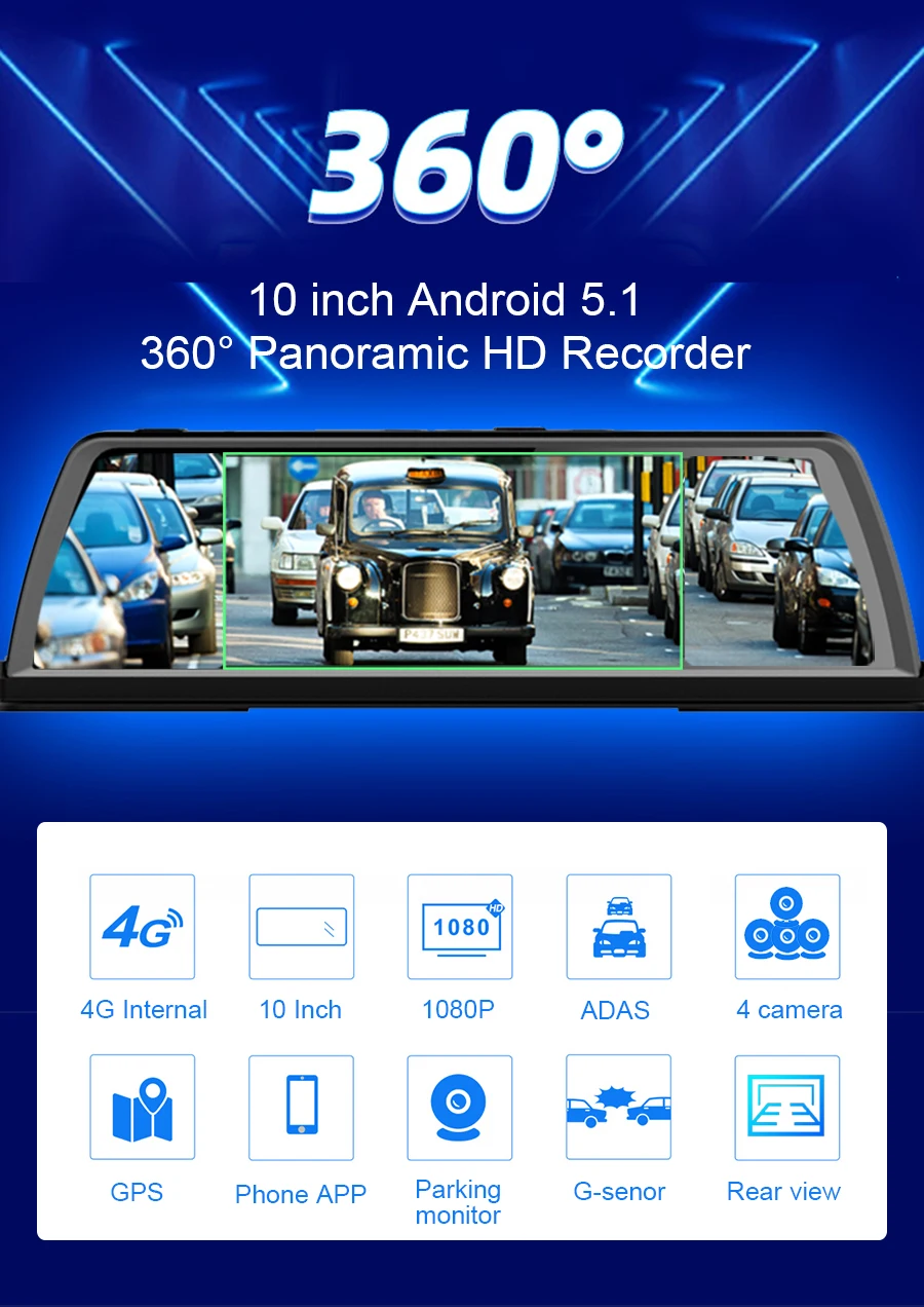 GPS навигация, Автомобильный видеорегистратор, монитор парковки, Bluetooth hands-free, WiFi, fm-передатчик, смарт-устройство с ОС Android 5,1, ADAS,4G интернет-серфинга, удаленный монитор, g-сенсор.