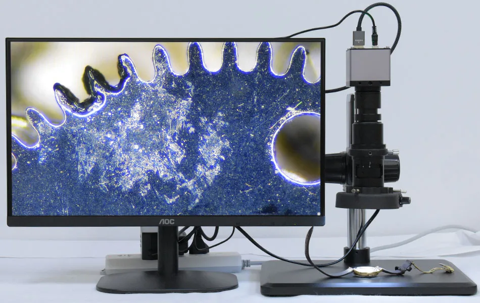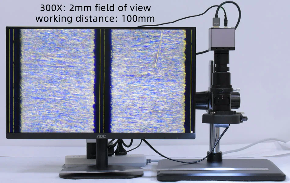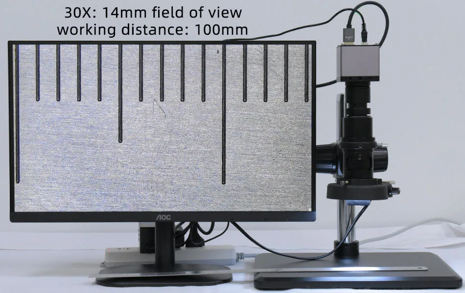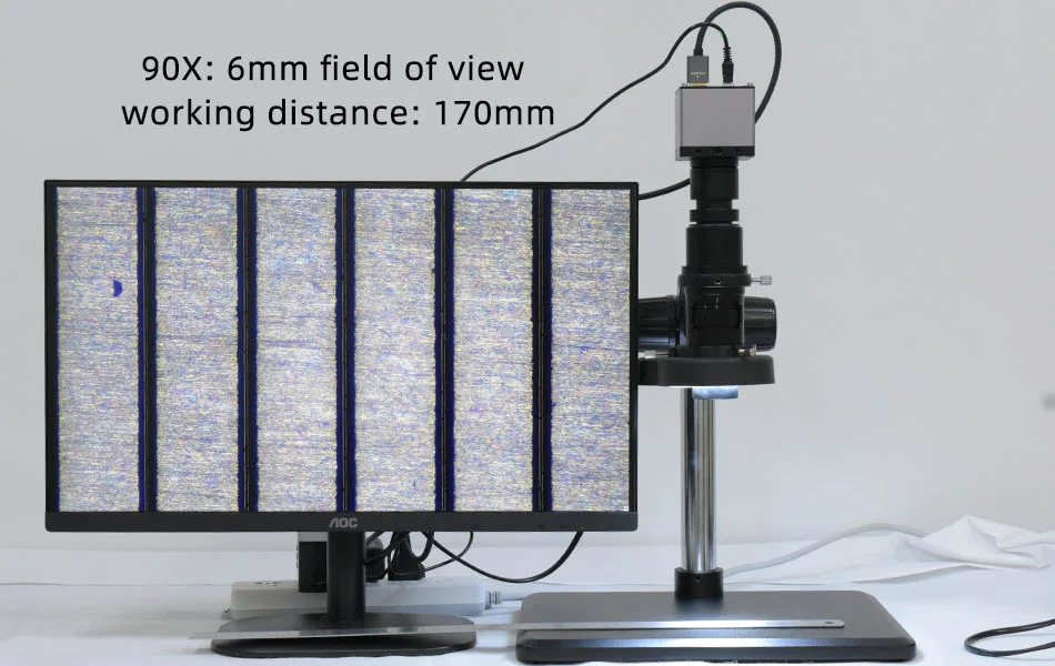 Camera parameters: Image specifications: 1920x1080 * 24Bit Frame rate: 60 frames / second @ 1920x1080 Optical size: 1/3 " Pixel size: 2.75x2.75um Photo resolution: 1920 * 1080 Recorded video: 1080P @ 30FPS Color adjustment: R, G, B are independently adjustable Strong light suppression mode: Level 3 Edge Enhancement Mode: Level 3 Crosshair function: superimpose or cancel Lens interface: C interface Power supply: 12V White balance adjustment: one-touch setting / manual setting Exposure adjustment: automatic mode / manual mode Contrast adjustment: manual setting Dimensions: 61x61x70mm Weight: 150g Working temperature: 0-70 ℃ 10X-90X C-Mount Lens: (10X-90X on the 21.5-inch Monitor, full focus) Working distance: 170mm Maximum field of view: 40mm*23mm Minimum field of view: 6mm*3mm Zoom C-Mount Lens 0.4X C-mount adapter Objective Magnification Power by 0.7X-5X 20X-180X C-Mount Lens: (20X-180X on the 21.5-inch Monitor, full focus) Working distance: 105mm Maximum field of view: 19.5mm*11mm Minimum field of view: 3mm*1.5mm Zoom C-Mount Lens 0.4X C-mount adapter Objective Magnification Power by 0.7X-5X 30X-300X C-Mount Lens: (30X-300X on the 21.5-inch Monitor, full focus) Working distance: 100mm Maximum field of view: 14mm*8mm Minimum field of view: 2mm*1mm Zoom C-Mount Lens 0.4X C-Mount Lens Objective Magnification Power by 0.7X-5X 144 LED light source: 144 white LED bulbs 100,000 hours of life Strong and concentrated shadowless lighting Brightness 0-100% adjustable, high brightness Variable intensity control Power input: 100-240V AC, 50-60HZ Suitable lens diameter: 30mm-61mm