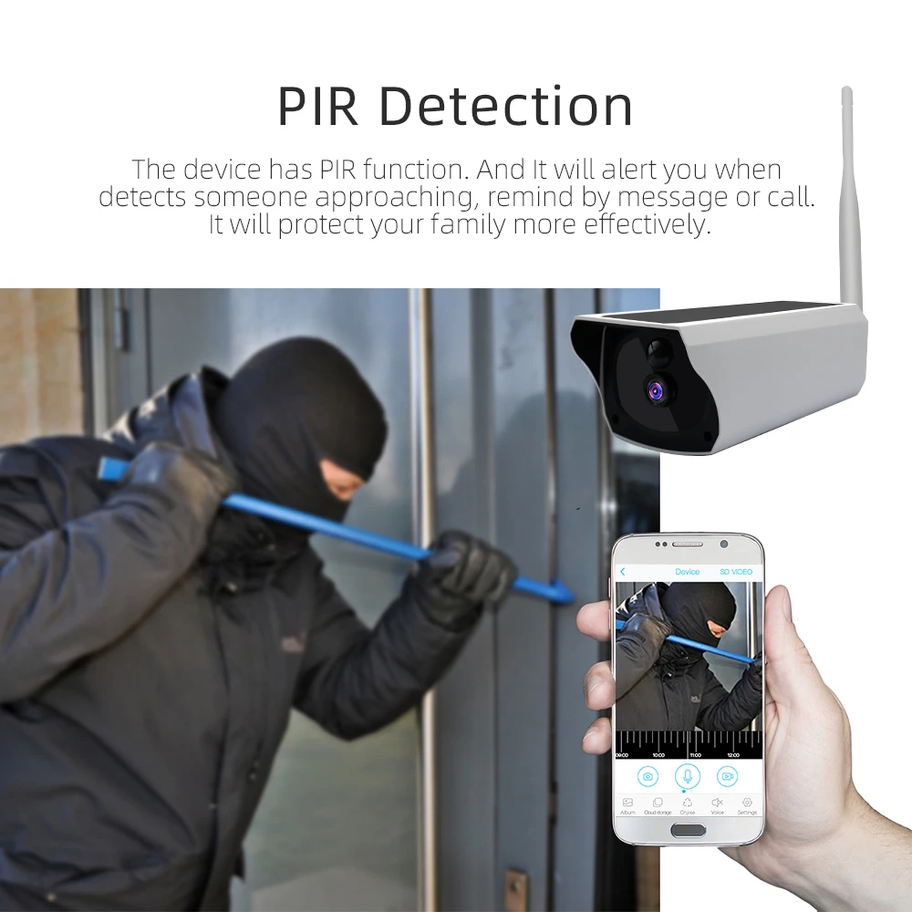 Параметры: ● Наружная камера на солнечных батареях ● 1080P/2,0 мегапикселя, широкий обзор 90 градусов Угол обзора ● Поддержка обнаружения движения PIR, сигнал тревоги Мобильный телефон ● Поддержка Wi-Fi соединения 2,4G, не Поддержка 5G. После подключения в наличии Удаленный доступ через 3G,4G. ● Поддержка мобильный телефон и ПИР обнаружения пробуждения Вверх ● Поддержка двусторонней внутренней связи ● Инфракрасное расстояние: 850 Нм инфракрасное, эффективное расстояние освещения около 10 метров ● Батарея: 2*18650 литиевая батарея, Солнечная Перезаряжаемый аккумулятор • Линзы: 3,6 мм ● Срок службы батареи: около 60 дней непрерывной дождливой погоды ● Зарядка: Непрерывная зарядка солнечной энергии, Поддержка USB порта около 6 часов полной зарядки Особенности: Уровень водонепроницаемости IP67 ● Изготовлен из алюминиевого сплава и инженерного пластикового материала ● На поверхности есть водонепроницаемое и антикоррозийное покрытие ● Так что он обладает хорошей теплоотдачей и эффективно предотвращает попадание пыли и дождь Несколькими пользователями поддерживается ● И поддержка 3 устройств для одновременного просмотра онлайн ● Поддержка мобильных телефонов и планшетов до 1 5-20 Оповещение при обнаружении движения уведомления ● Можно смотреть домашнюю охранную систему, встроенную функцию оповещения, разность в доме часто толкается на телефон, так что вы На самом деле не беспокойтесь Двухстороннее аудио ● Нажмите на кнопку на вашем смартфоне, вы можете легко достичь двустороннего интеркома с удаленной визуальной связью Когда и где вы хотите Человека распознавания лиц ● Встроенная функция пуска сигнала тревоги, будет немедленно пускать сообщение в приложение при отслеживании аномальной ситуации в В помещении Пассивный инфракрасный детектор движения ● Автоматическое Пробуждение камеры, когда кто-то или объект проходит, запуск записи, отправка сообщения на телефон Два способа хранения видео; ● Солнечная камера поставляется с двумя режимами хранения, облачным хранилищем и локальным хранилищем ● Когда sd-карта заполнена, она автоматически закрывает самое раннее видео, автоматически записывает без сети Бесплатное Облачное хранилище ● 20 секций видео (8 секунд) можно сохранять в день ● Автоматическое покрытие петли каждые 7 дней (Облачное хранилище бесплатно) Можно настроить в любом месте ● Tunned/grassland/high way/orchard/farm/no man land/railway crossing/dam Упаковочный лист: 1 * Руководство пользователя 1 * кронштейн 1 * винтов 1 * Солнечная Wifi камера