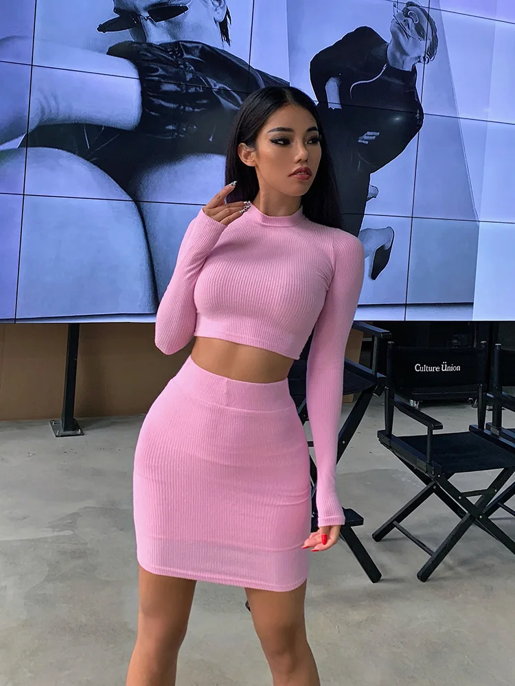 Название продукта: одежда для женщин, милый комплект с круглым вырезом, розовый комплект из двух предметов с длинными рукавами, привлекательный летний облегающий костюм с юбкой и топом, спортивный костюм из полиэстера