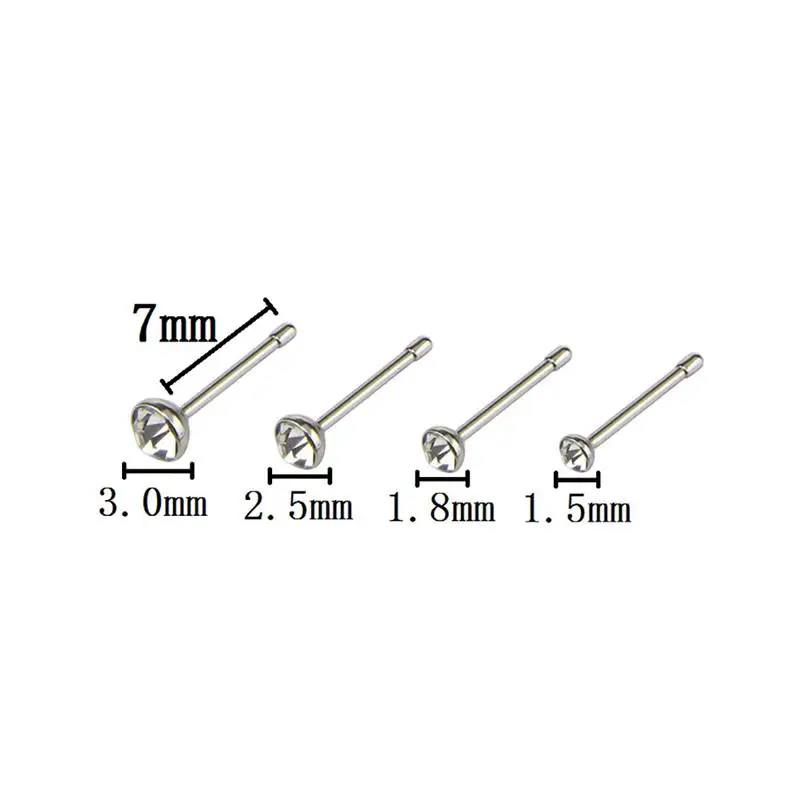 Шпилька для носа: Длина стержня: 7 мм (0,28 дюйма), диаметр камня: S 1,5 мм (0,06 дюйма), M 1,8 мм (0,07 дюйма), L 2,5 мм (0,10 дюйма), XL 3 мм (0,12 дюйма)