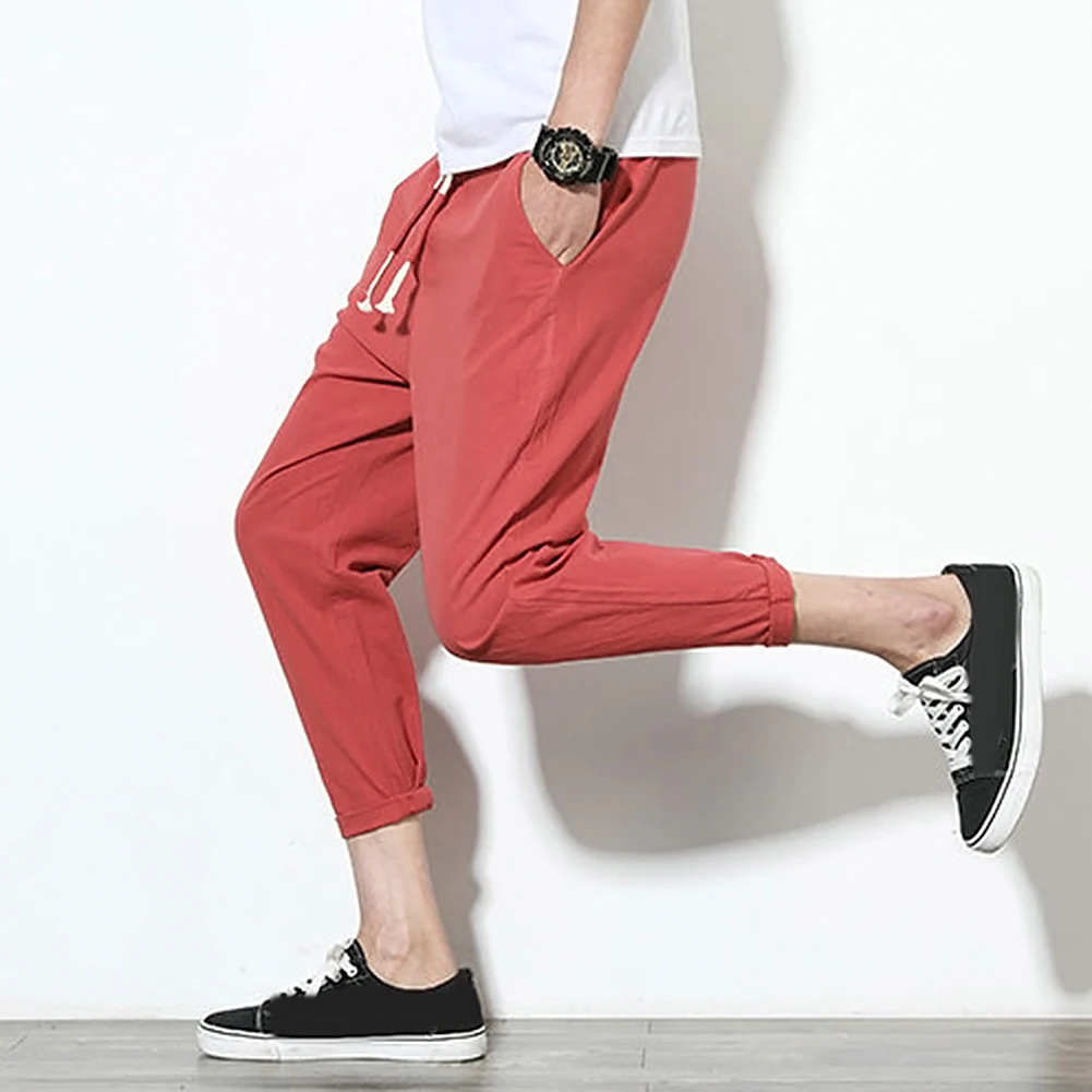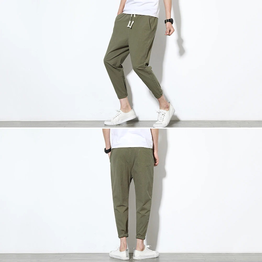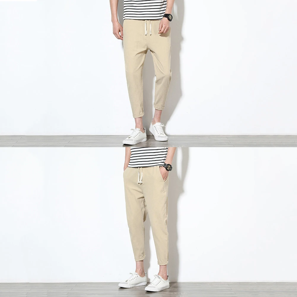 Men Casual Solid Color Ankle Tied Pockets Drawstring Sports Long Pants Trousers