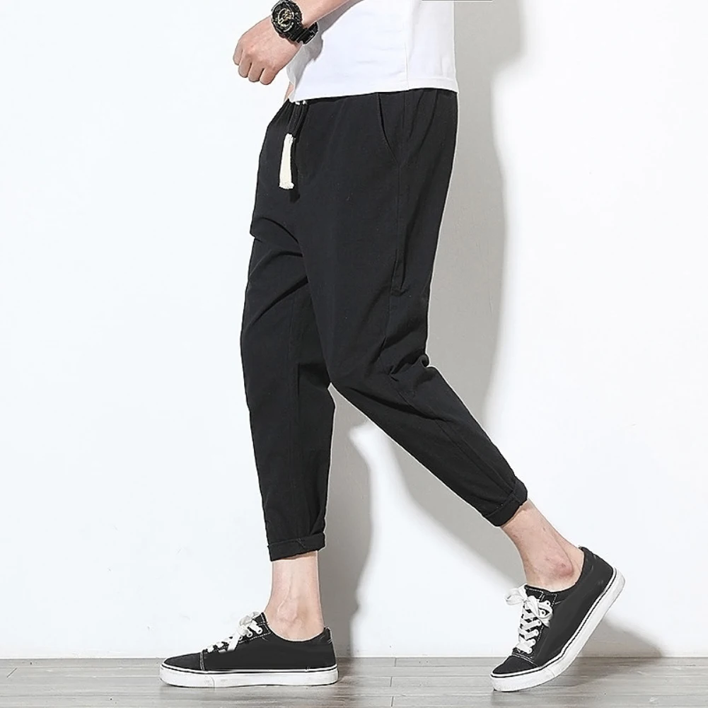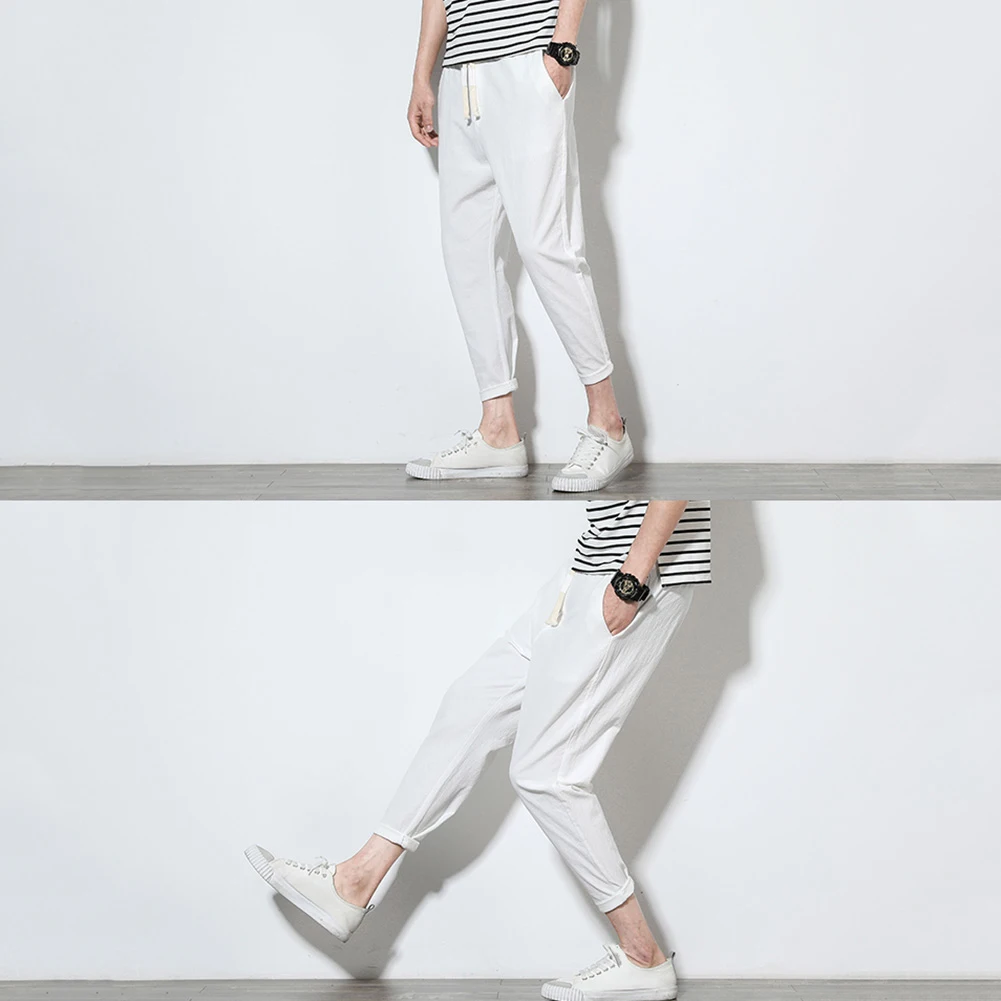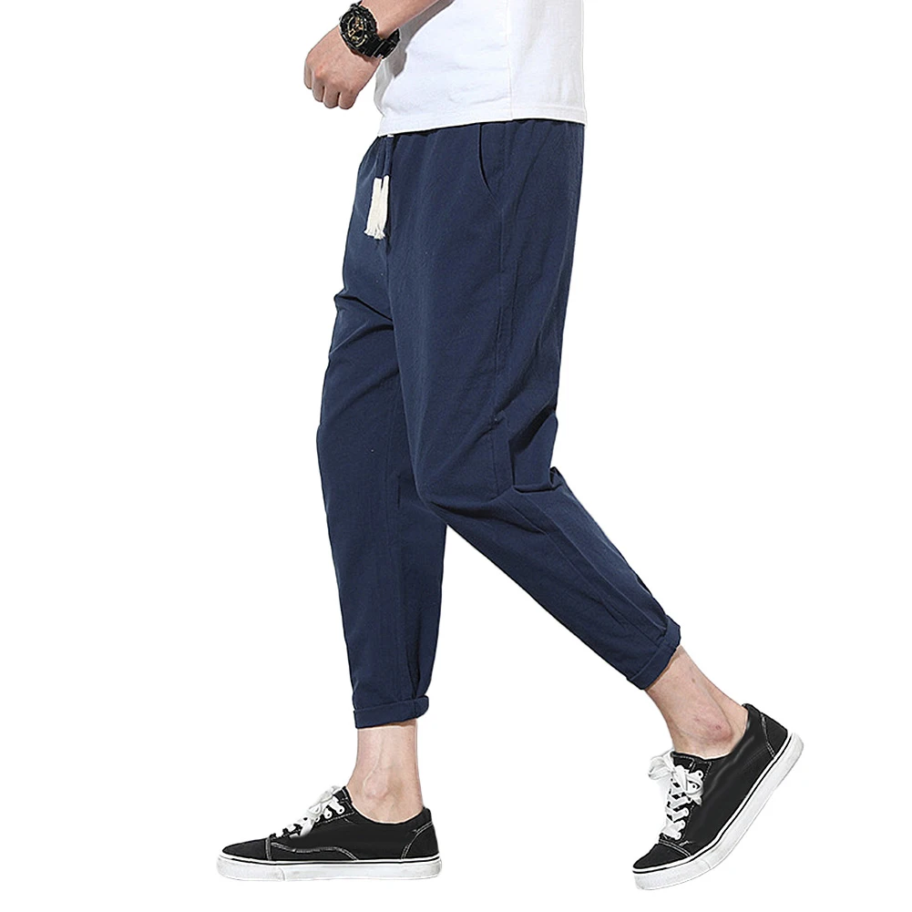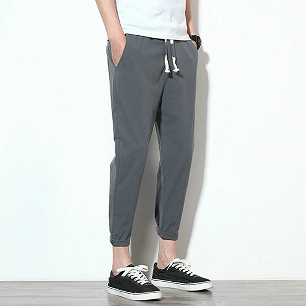 Men Casual Solid Color Ankle Tied Pockets Drawstring Sports Long Pants Trousers