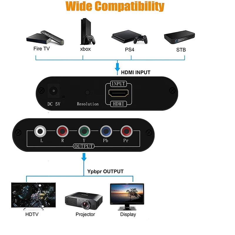 2. Выходные порты: 1 × ypbpr (красный, зеленый, синий);1 × аудио (красный, белый)