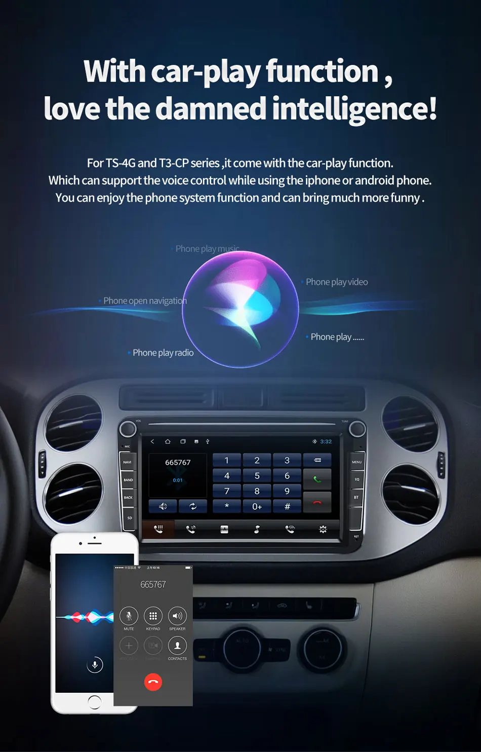 For TS-4G and T3-CP series ,it come with the car-play function. Which can support the voice control while using the iphone or android phone. You can enjoy the phone system function and can bring much more funny .